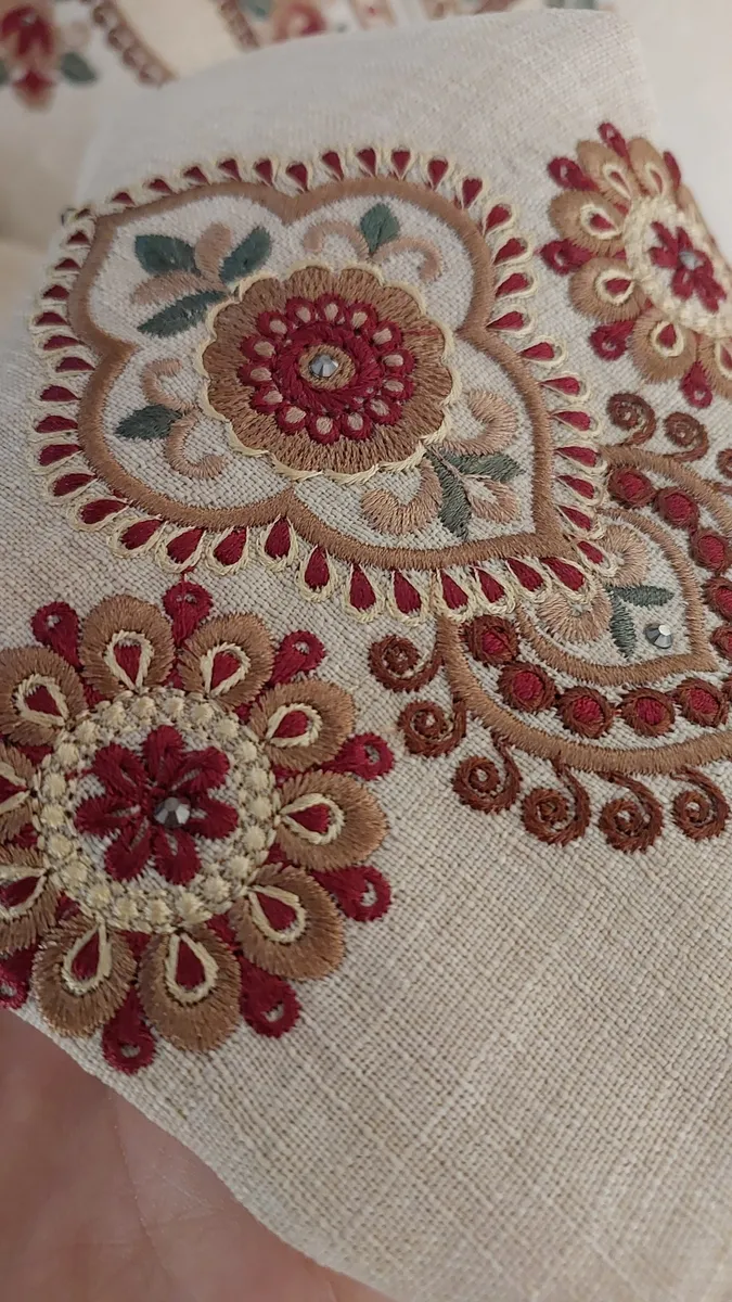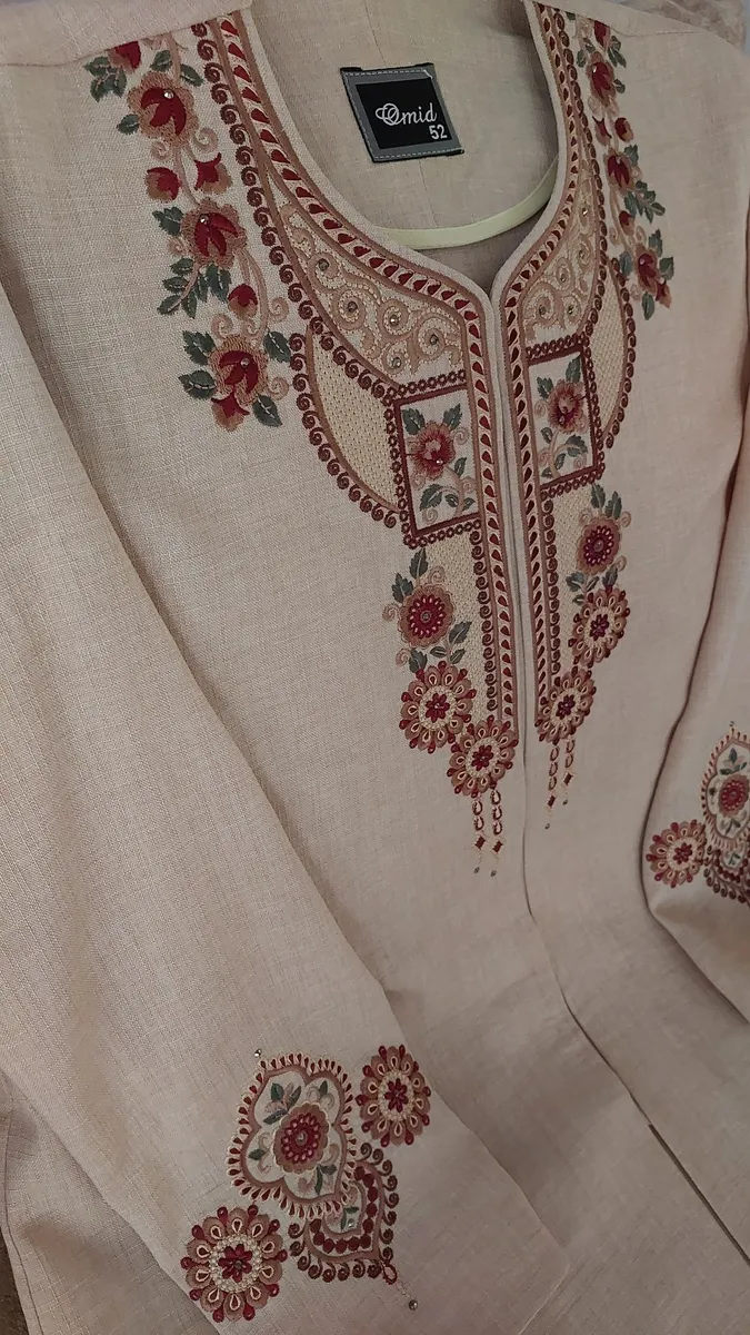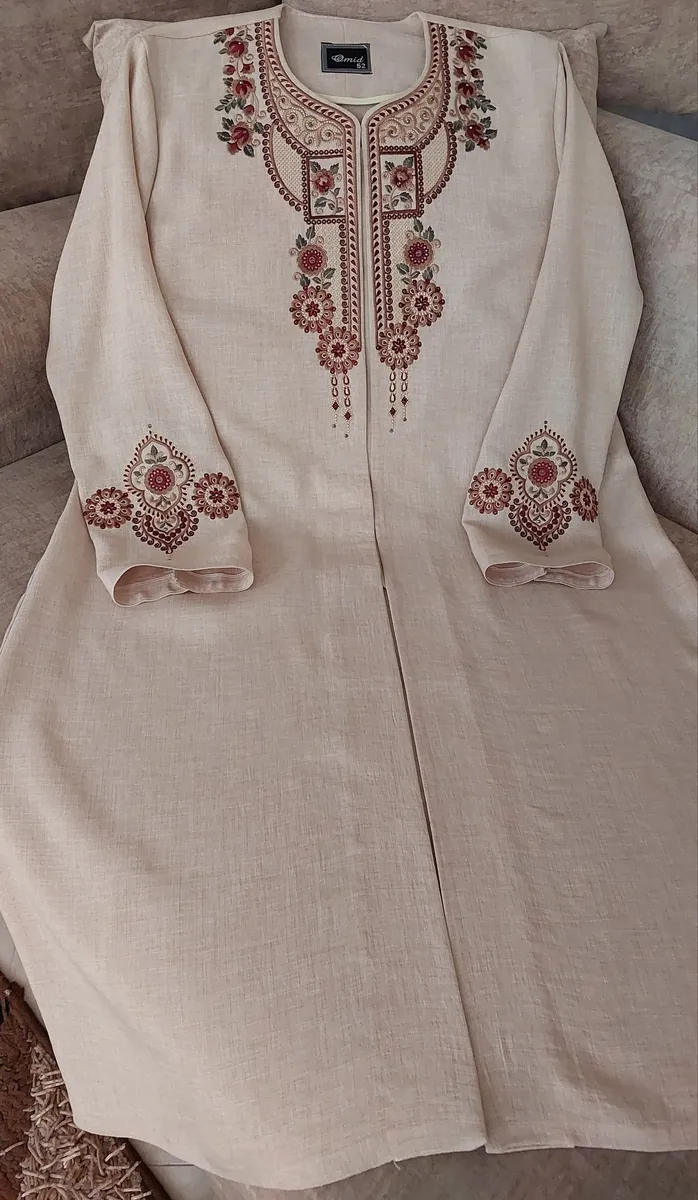 بر روی زمینهی ساده و شیک پارچه، **گلدوزیهای رنگی و ظریف** با دقتی هنرمندانه کار شده است. این جزئیات زیبا، مانتو را از یک مدل ساده فراتر برده و به آن شخصیتی منحصر به فرد میبخشد. این نقش و نگارها، بدون آنکه استایل شما را شلوغ کنند، جلوهای از هنر و سلیقه را به نمایش میگذارند.
