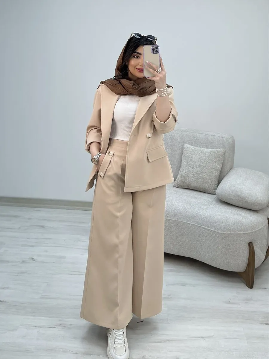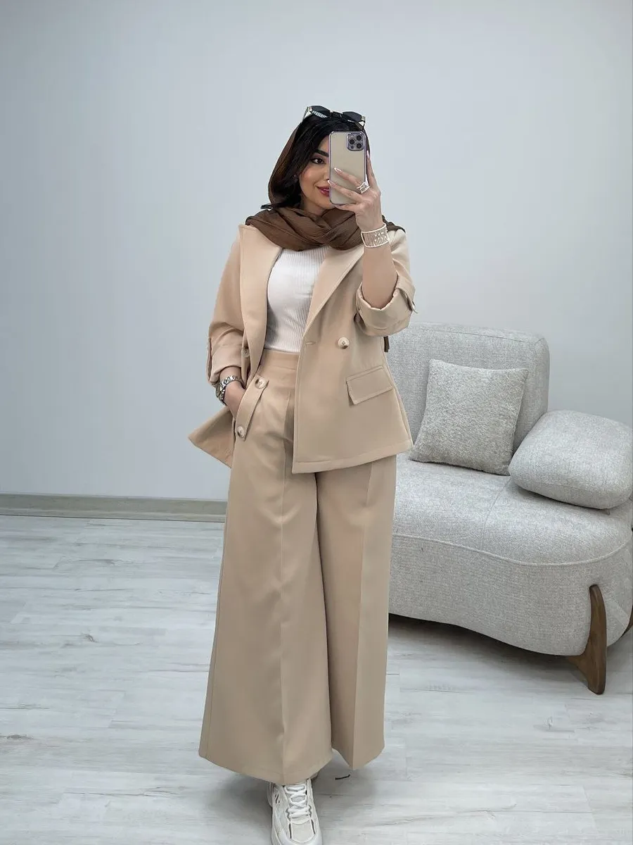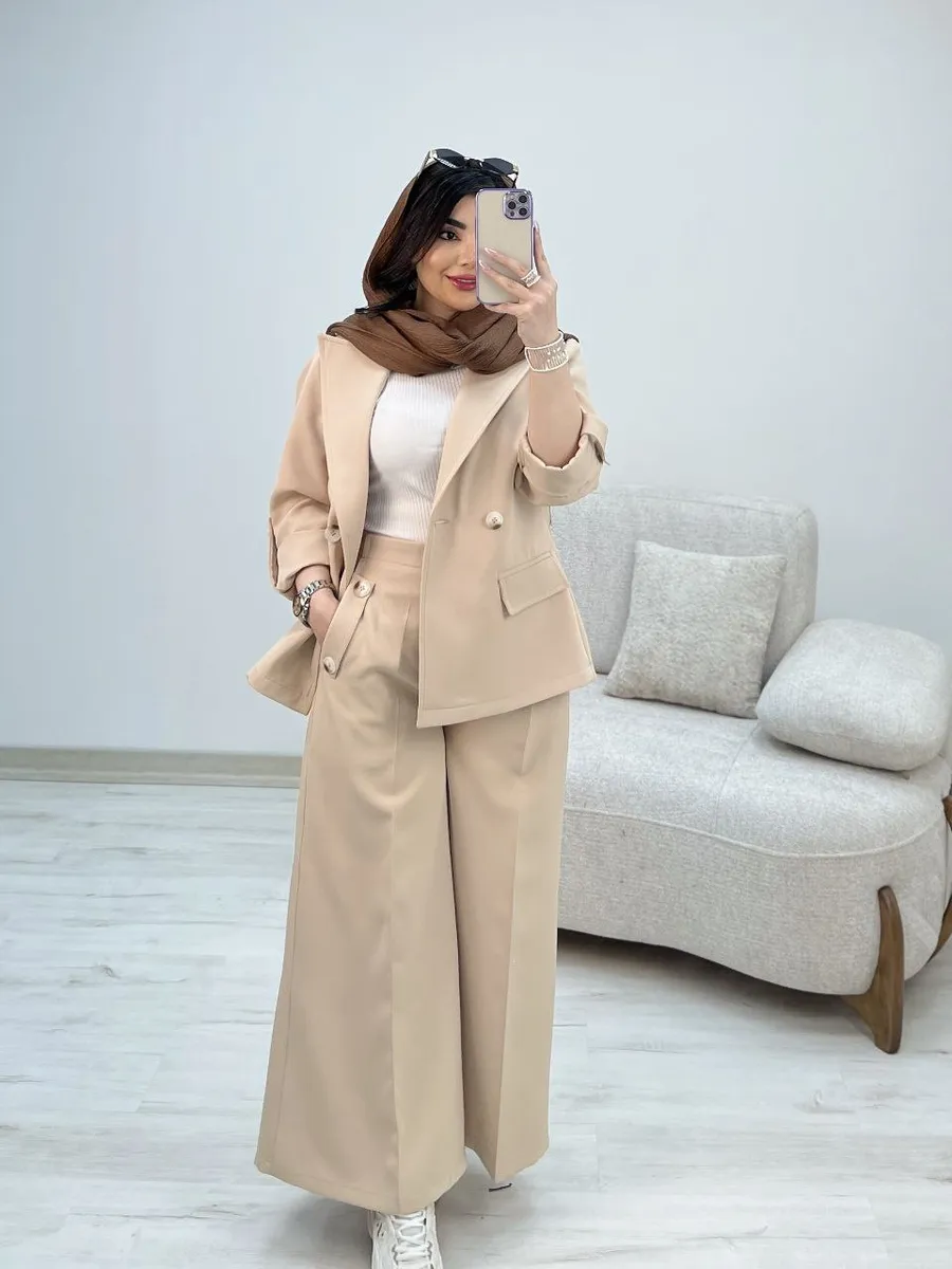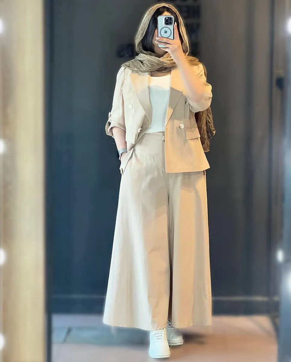 شلوار این ست با **برش واید لگ (گشاد)** و دمپای پهن، نه تنها راحتی بینظیری را به ارمغان میآورد، بلکه کاملاً مطابق با آخرین ترندهای دنیای مد است. طراحی هوشمندانه کمر شلوار، ترکیبی از بهترینهاست: **پشت کمر کش** برای راحتی و فیت شدن کامل، و **زیپ و دکمه در جلو** برای حفظ ظاهر شیک و رسمی یک شلوار کلاسیک. وجود دو جیب کاربردی، این شلوار را به انتخابی بینقص تبدیل کرده است.