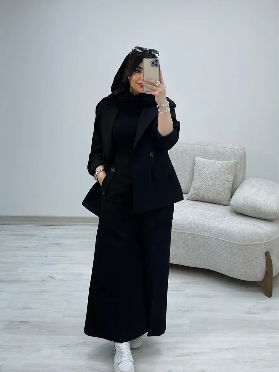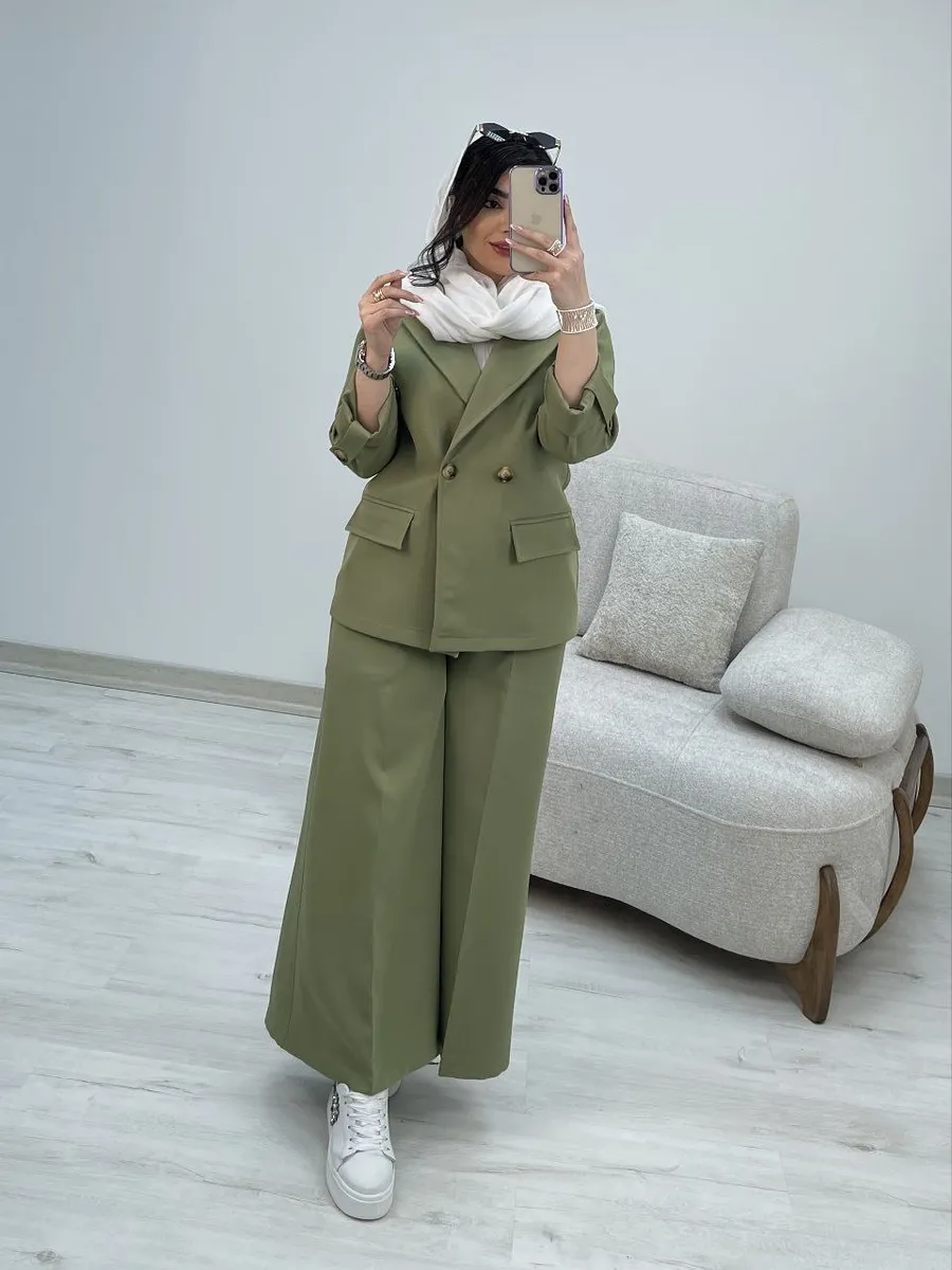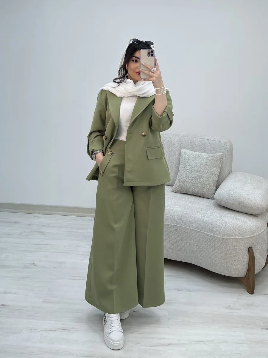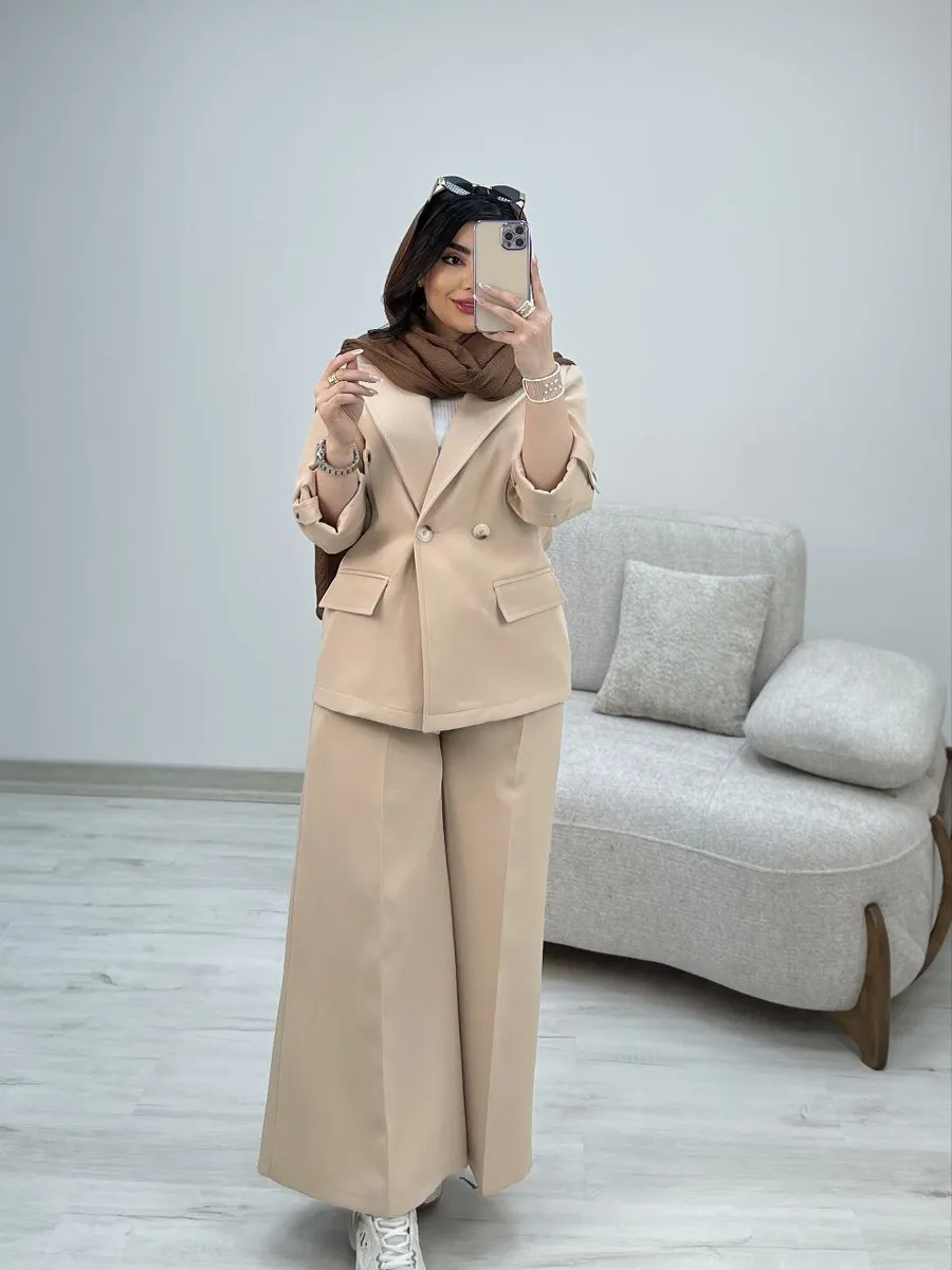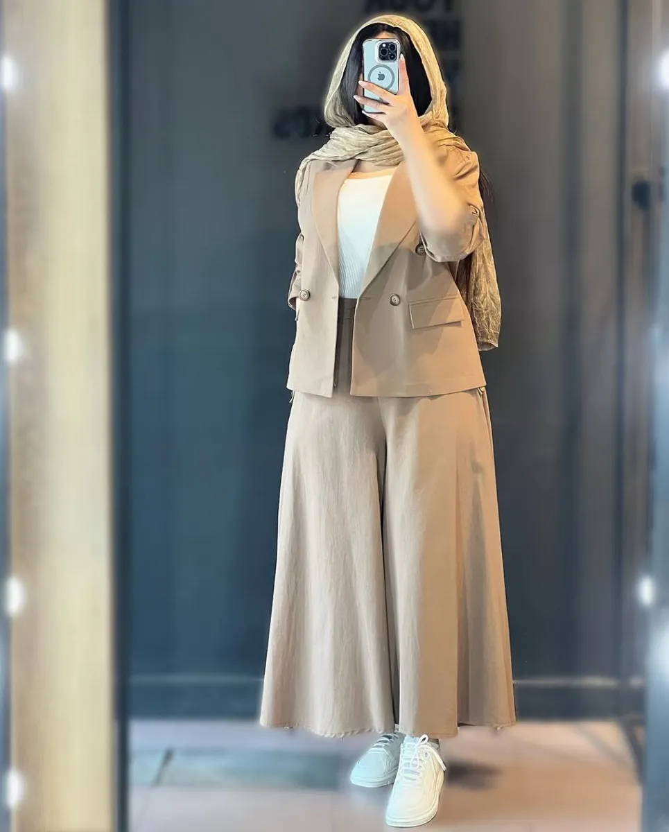 شلوار این ست با **برش واید لگ (گشاد)** و دمپای پهن، نه تنها راحتی بینظیری را به ارمغان میآورد، بلکه کاملاً مطابق با آخرین ترندهای دنیای مد است. طراحی هوشمندانه کمر شلوار، ترکیبی از بهترینهاست: **پشت کمر کش** برای راحتی و فیت شدن کامل، و **زیپ و دکمه در جلو** برای حفظ ظاهر شیک و رسمی یک شلوار کلاسیک. وجود دو جیب کاربردی، این شلوار را به انتخابی بینقص تبدیل کرده است.