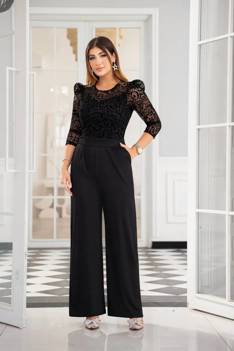 پارچه **فلوک گیپوری** در قسمت بالاتنه با بافت مخملی و طرح برجسته خود جلوهای لوکس دارد؛ در حالی که بخش پایینتنه از پارچه **غواصی باکیفیت بالا** تهیه شده تا استایل در عین راحتی، خوشفرم و ایستا باشد.