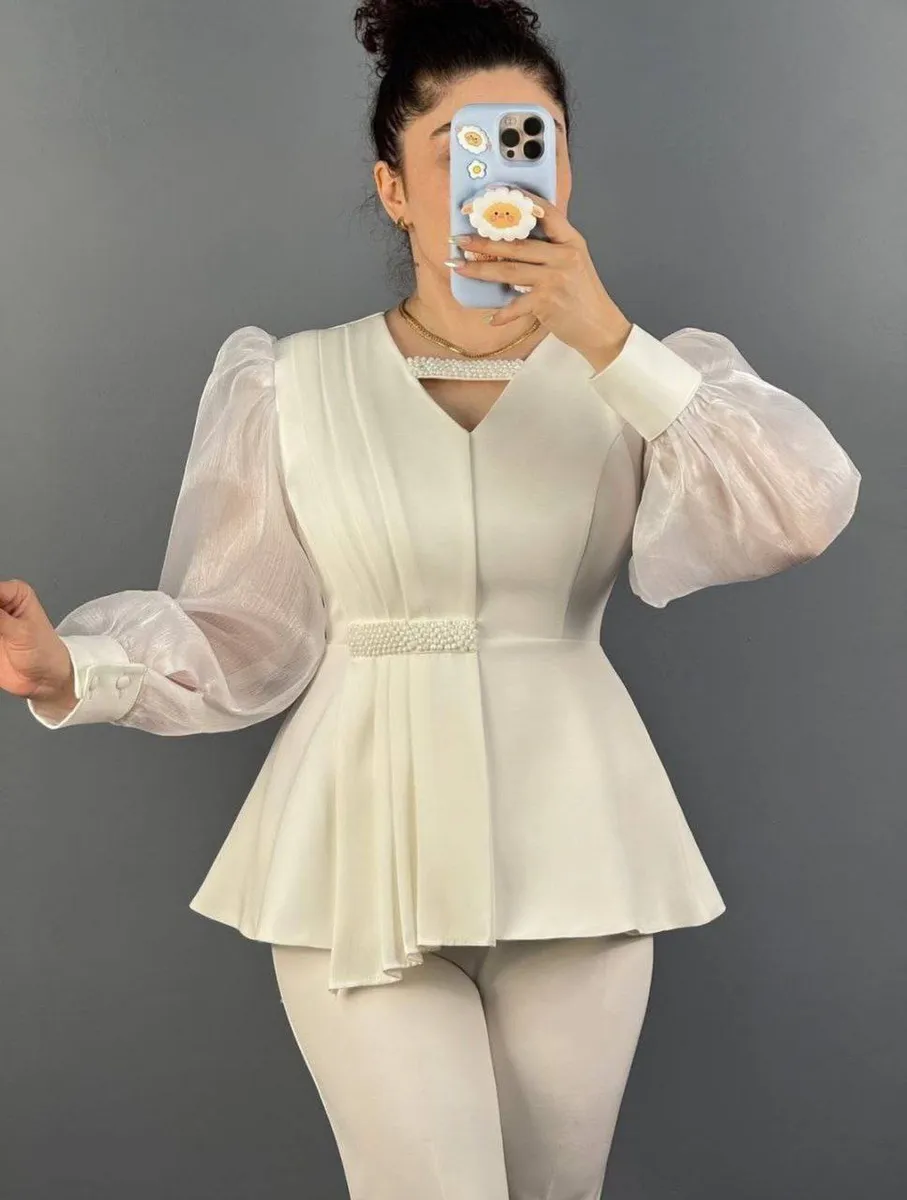 **آستین ارگانزا اعلا** در کنار **تور زیر ارگانزا برای ایجاد پف طبیعی آستین**، نمایی فاخر و لطیف ایجاد میکند.