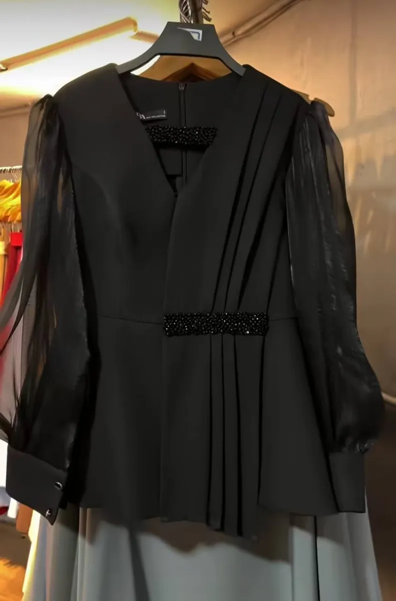 جزئیات **خرجکار مرواریدی دستدوز شده** با دقت مزونی روی لباس، امضای ظرافت و کیفیت دوخت این مدل بهحساب میآید.