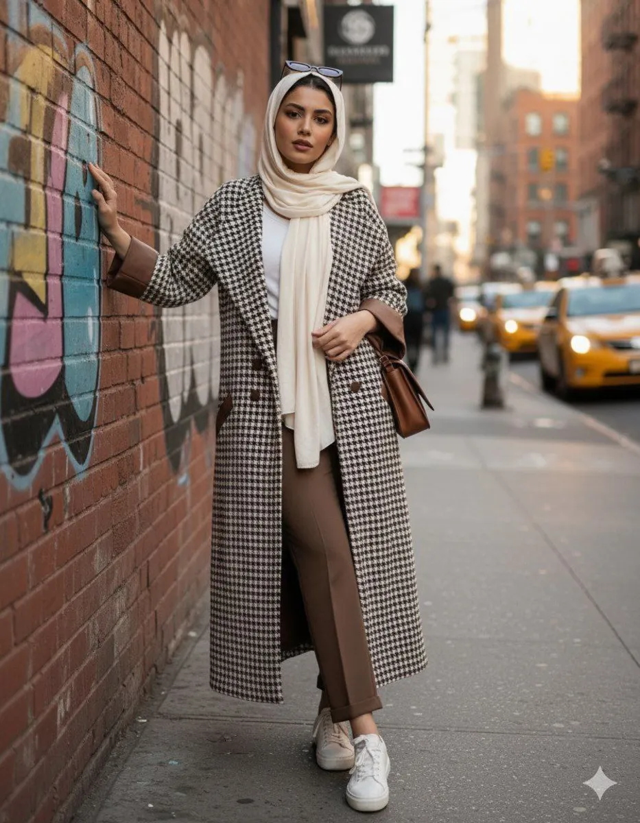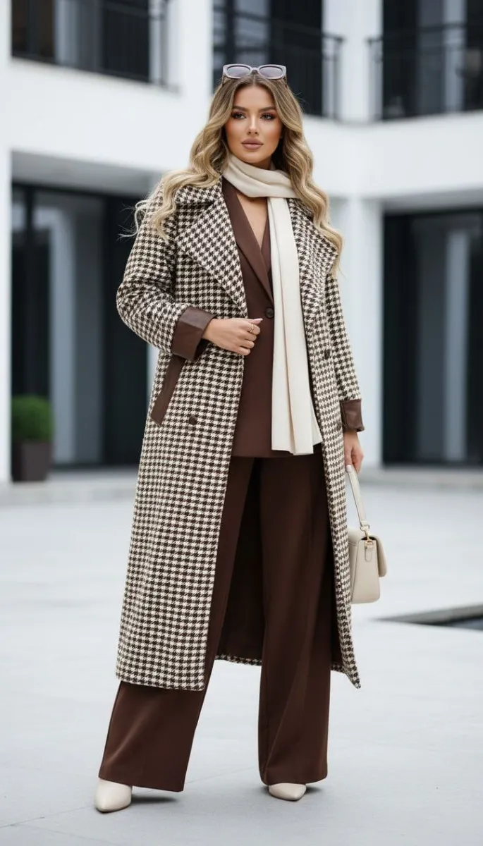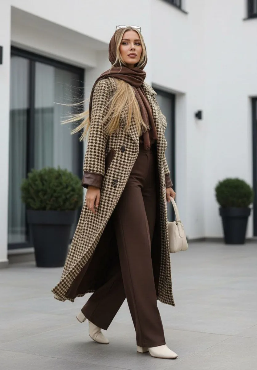 این پالتوی بلند، گرمای لازم و درعینحال شیکپوشی پاییزی را فراهم کرده و گزینهای عالی برای استایلهای روزمره، دانشگاهی و رسمی است. ترکیب رنگهای کلاسیک با پارچه موهر، به راحتی با بوت، کیف دستی و شالهای پاییزه ست میشود.