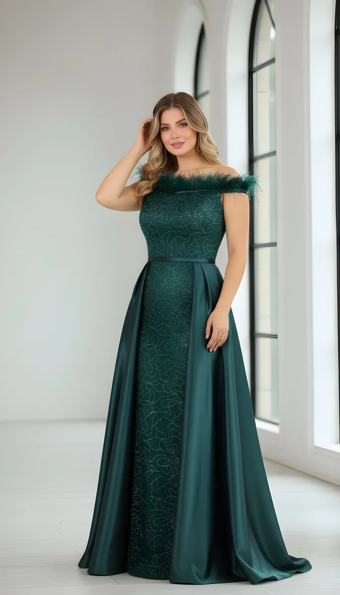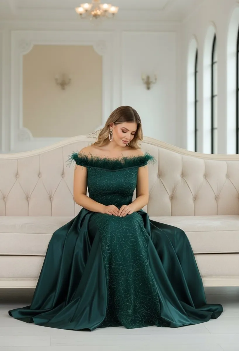 این لباس مجلسی بلند با جلوهی سبز شاین و دنبالهی ساتن، برای استایل زنان جسور و ظریف در مجالس شب بهترین انتخاب است — نمایانگر شکوه، ظرافت و درخشش حقیقی مزونی مودینو.