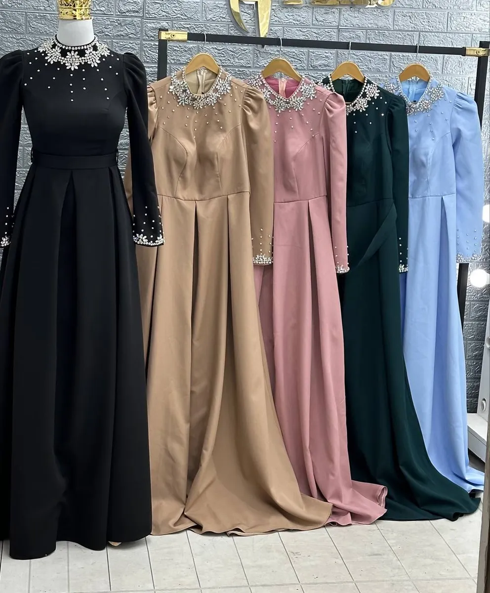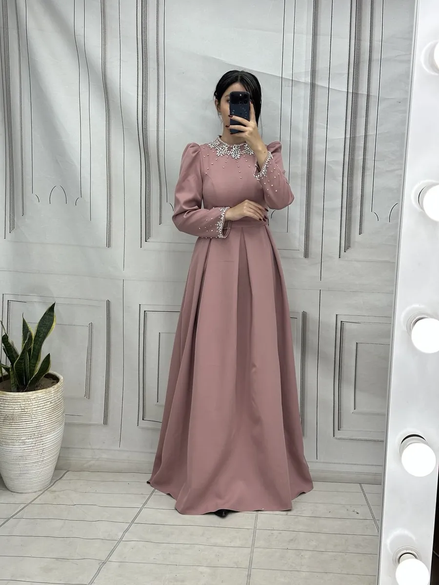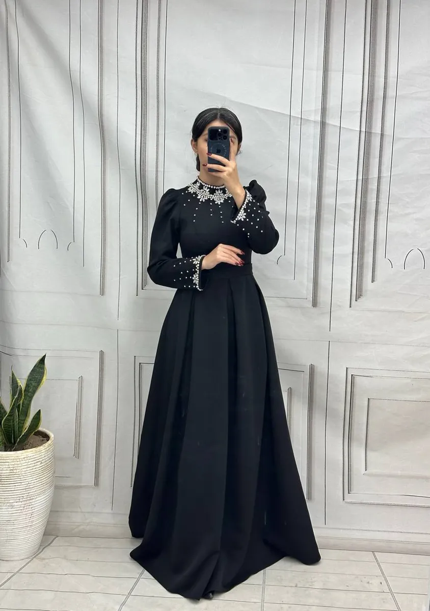 - **مدل:** لباس مجلسی بلند پوشیده، آستینبلند و کار شده