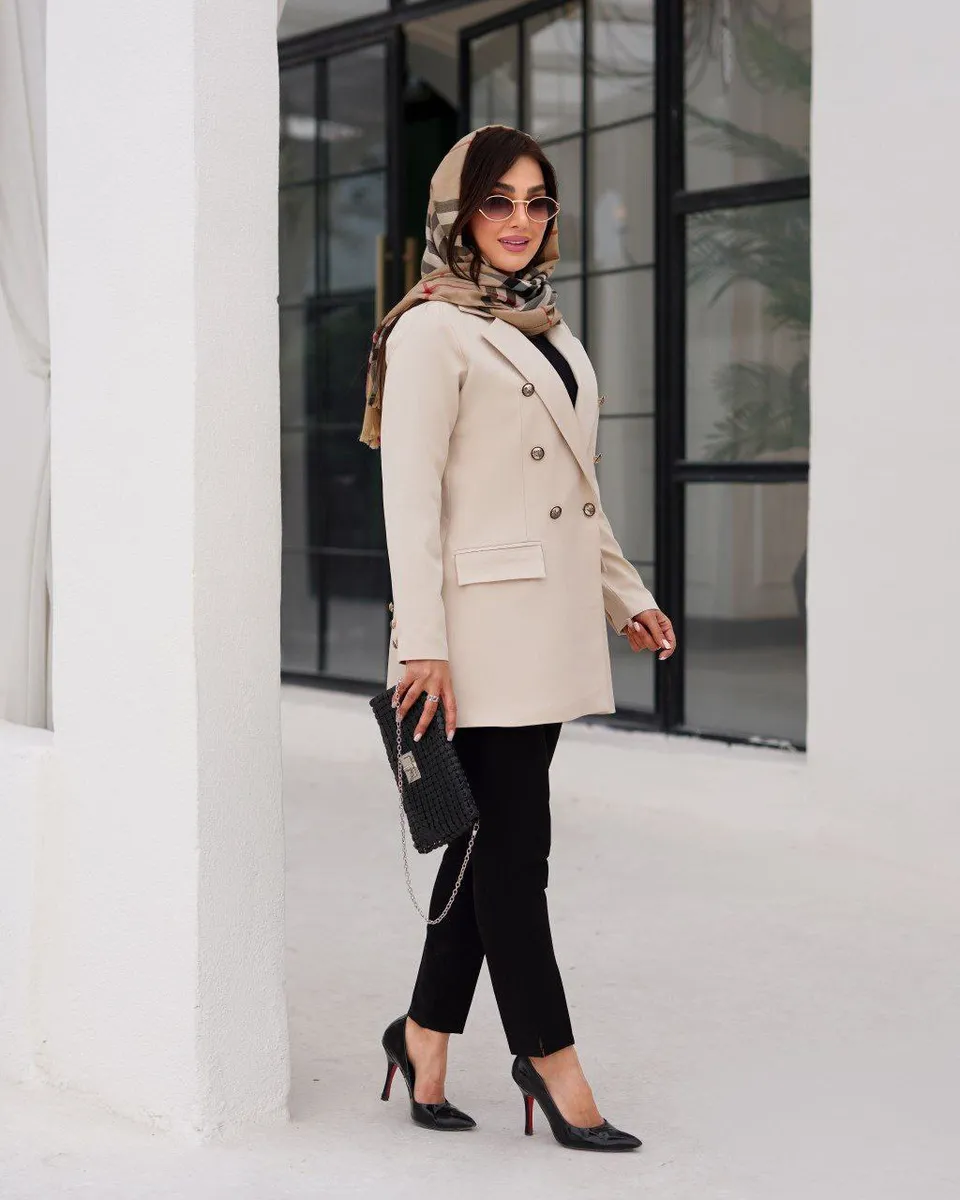 این مانتوی کتی کوتاه با فرم زنانه و تنخور منظم، گزینهای عالی برای استایلهای اداری، مجلسی و همچنین استایل روزمره لوکس است. پارچه مازراتی کج راه از مقاومترین و شیکترین جنسها برای پاییز و زمستان بهشمار میرود که فرم خود را کاملاً حفظ میکند.