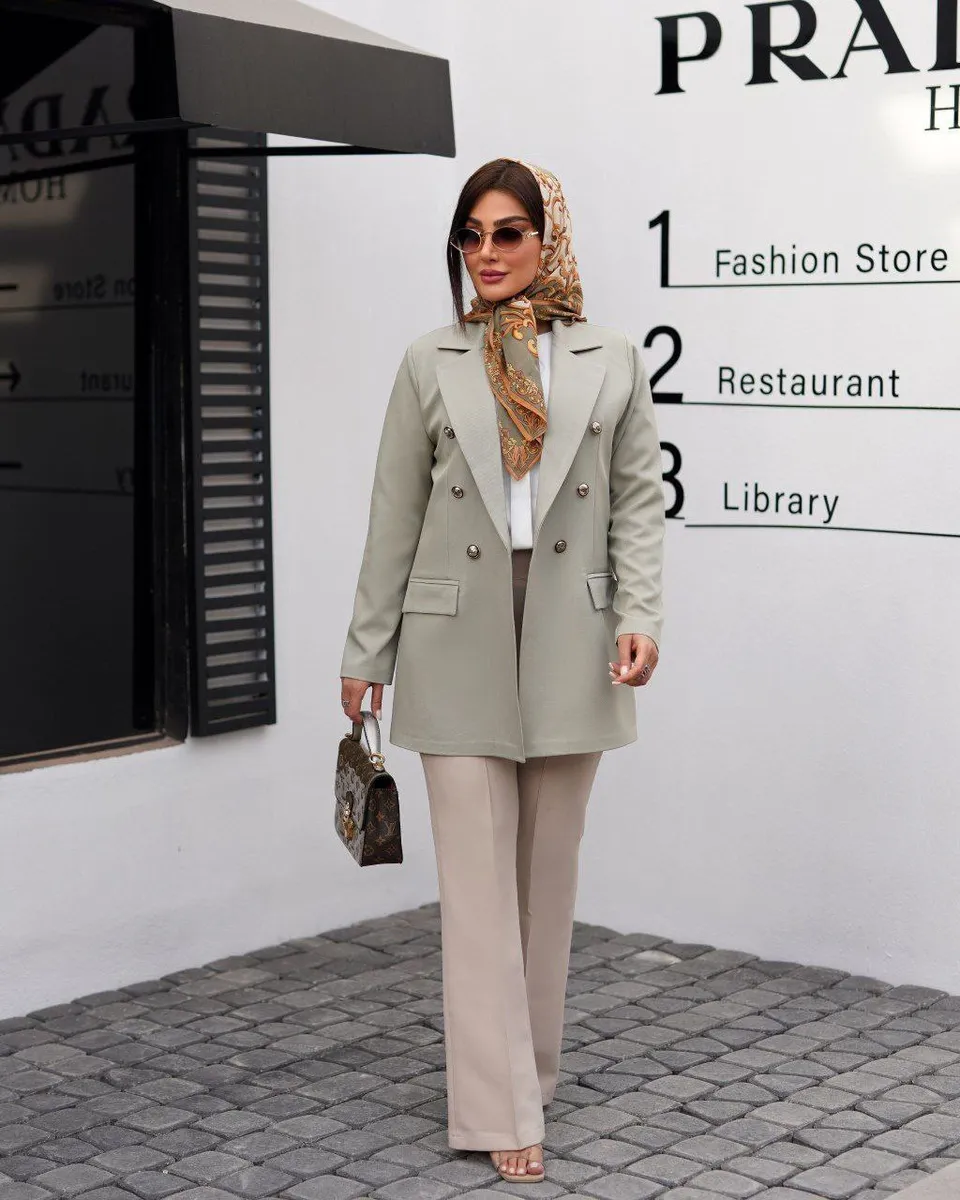 طراحی کت تک دکمه با لایی پرشین NFS در پیش کار، دوختهشده به صورت فرمدار و خوش ایست است تا حین پوشیدن هارمونی و دوام جلوهای مزونی و خاص ایجاد کند.