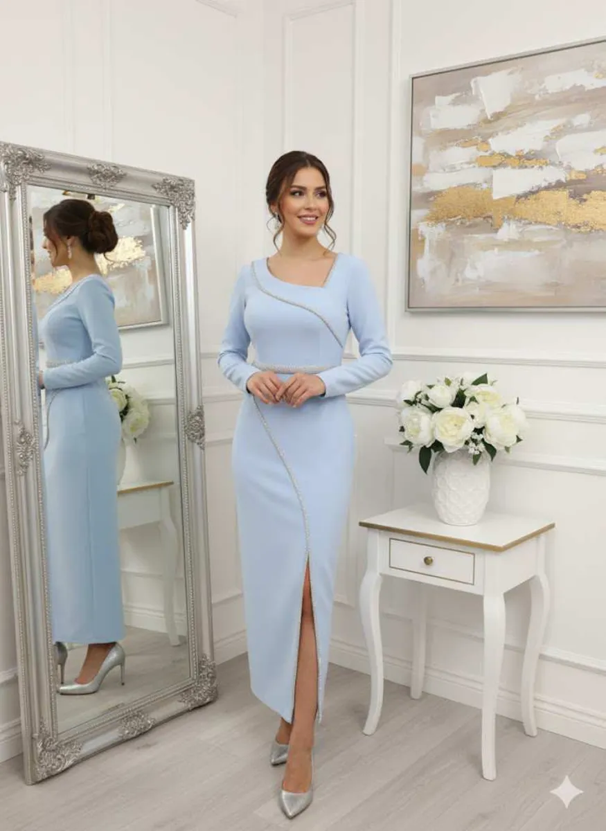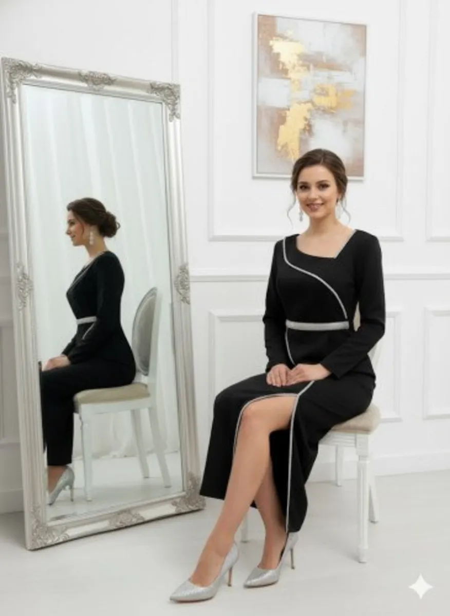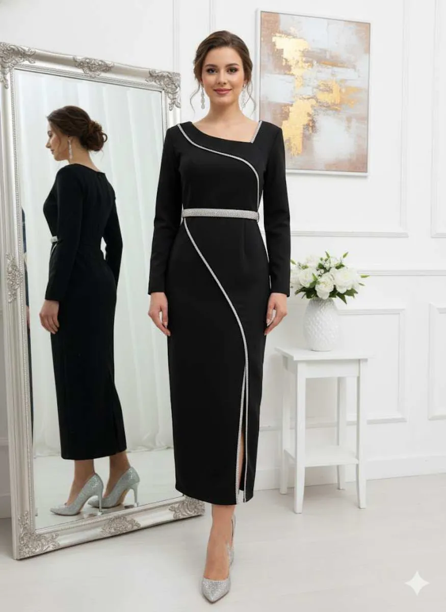 لباس مجلسی زنانه مدل **هلیا** از کالکشن جدید مودینو، با طراحی راسته و برشهای مزونی، انتخابی بینقص برای مهمانیها و مراسم رسمی است.