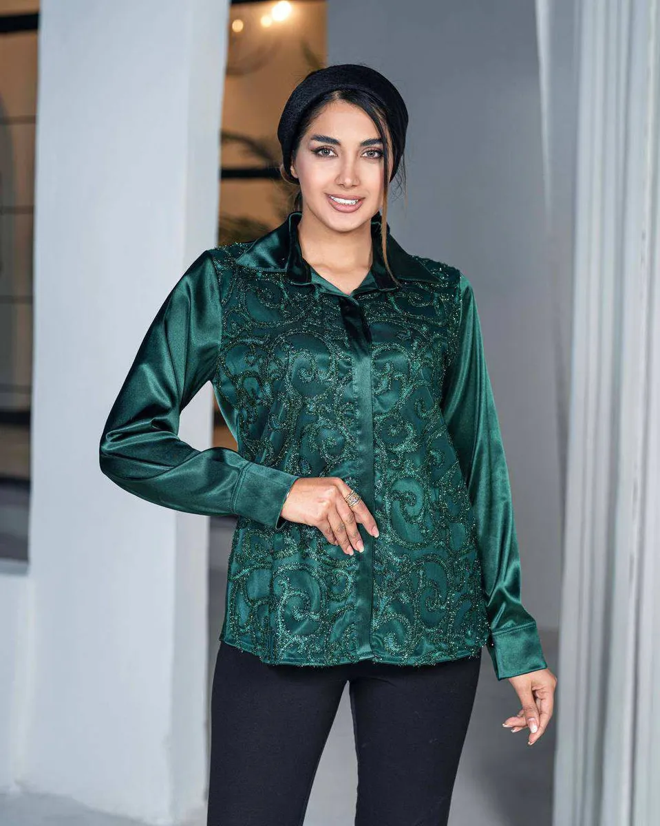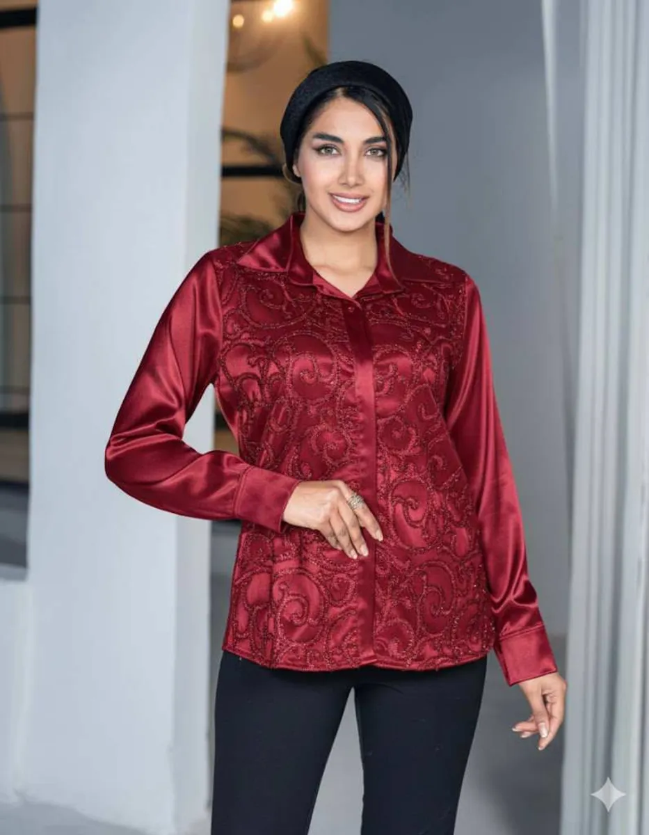 شومیز الیکا با پارچه درخشنده ساتن و دانتل کارشده در لب آستین و یقه، جلوهای خاص برای استایل یلدای شما میآفریند. ترکیب رنگهای گرم قرمز و سبز، مطابق حال و هوای یلدا، این مدل را به پرفروش ترین شومیز یلدایی مودینو تبدیل میکند.