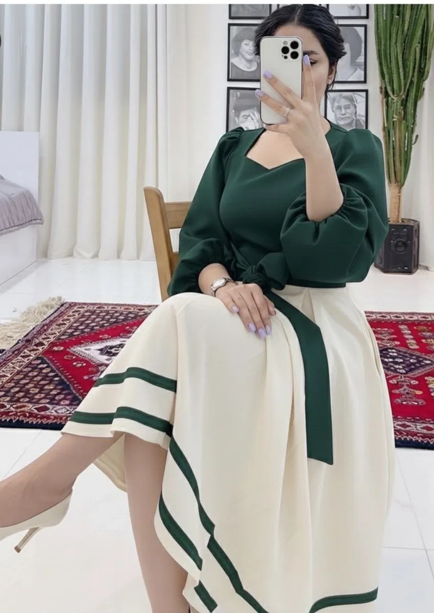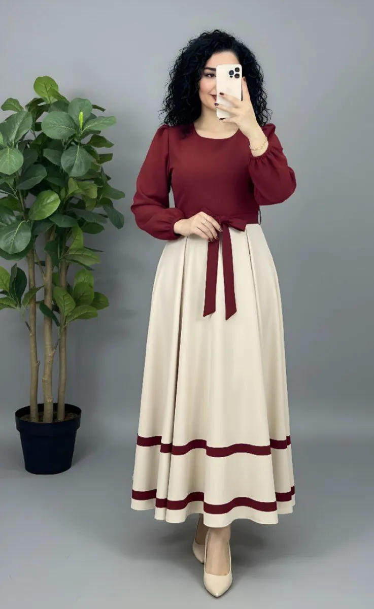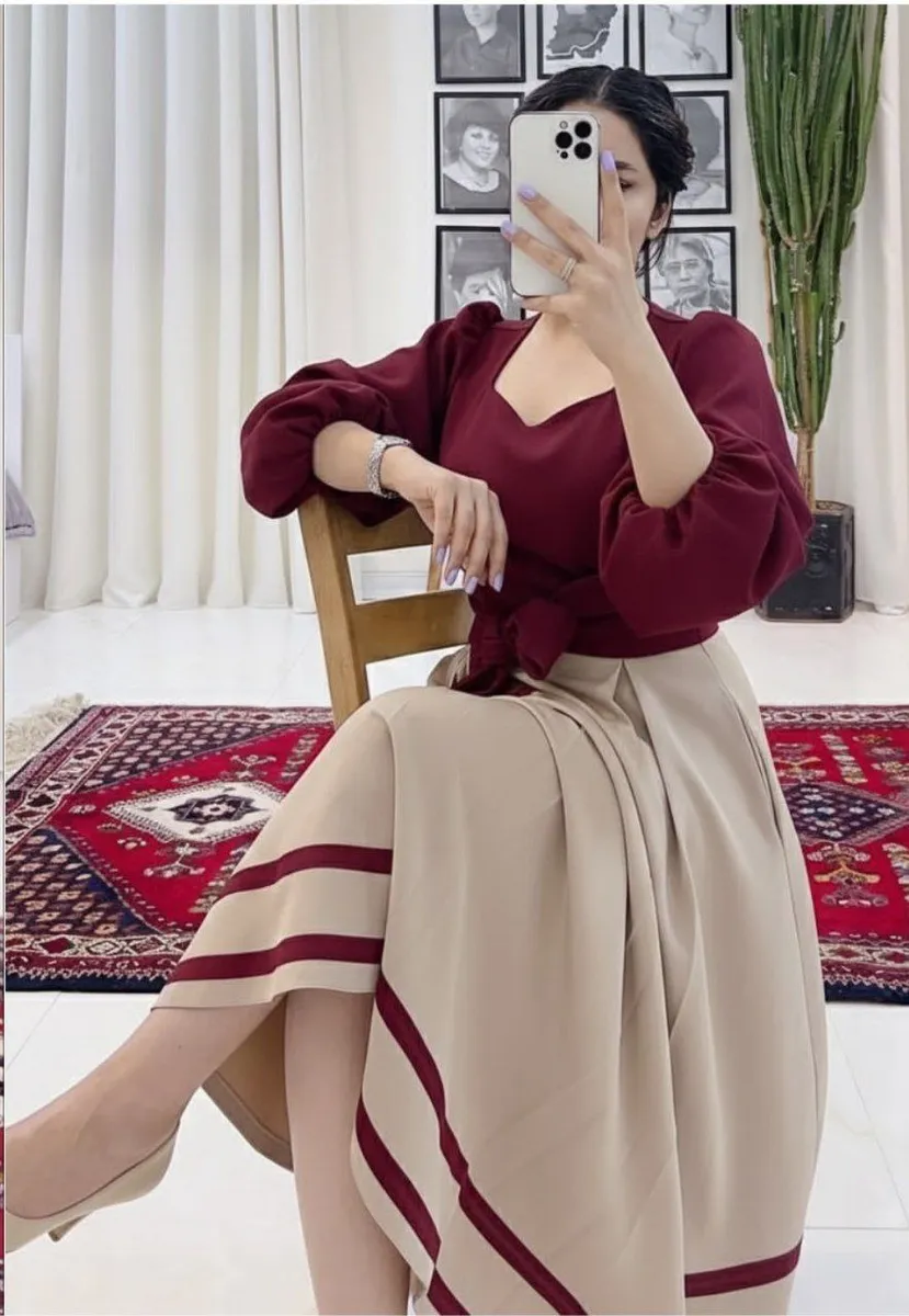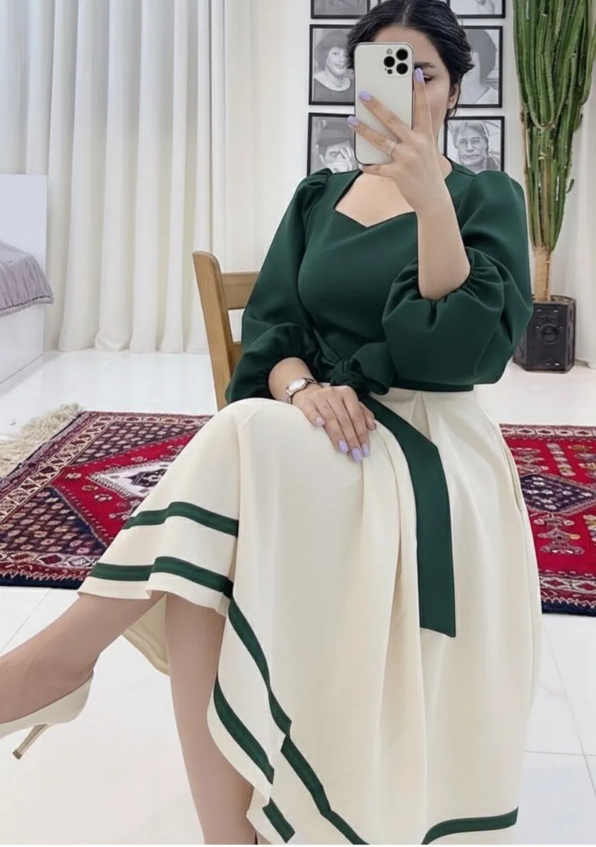 این مدل در رنگهای شیک و یلدایی زرشکی، سبز و سورمهای موجود است و گزینهای جذاب برای استایلهای رسمی و مجلسی محسوب میشود. نسخه قرمز/زرشکی این پیراهن با دامن کلوش برای تم یلدا فوقالعاده جلوه میکند و ظاهری خاص و مجلل ایجاد میکند.