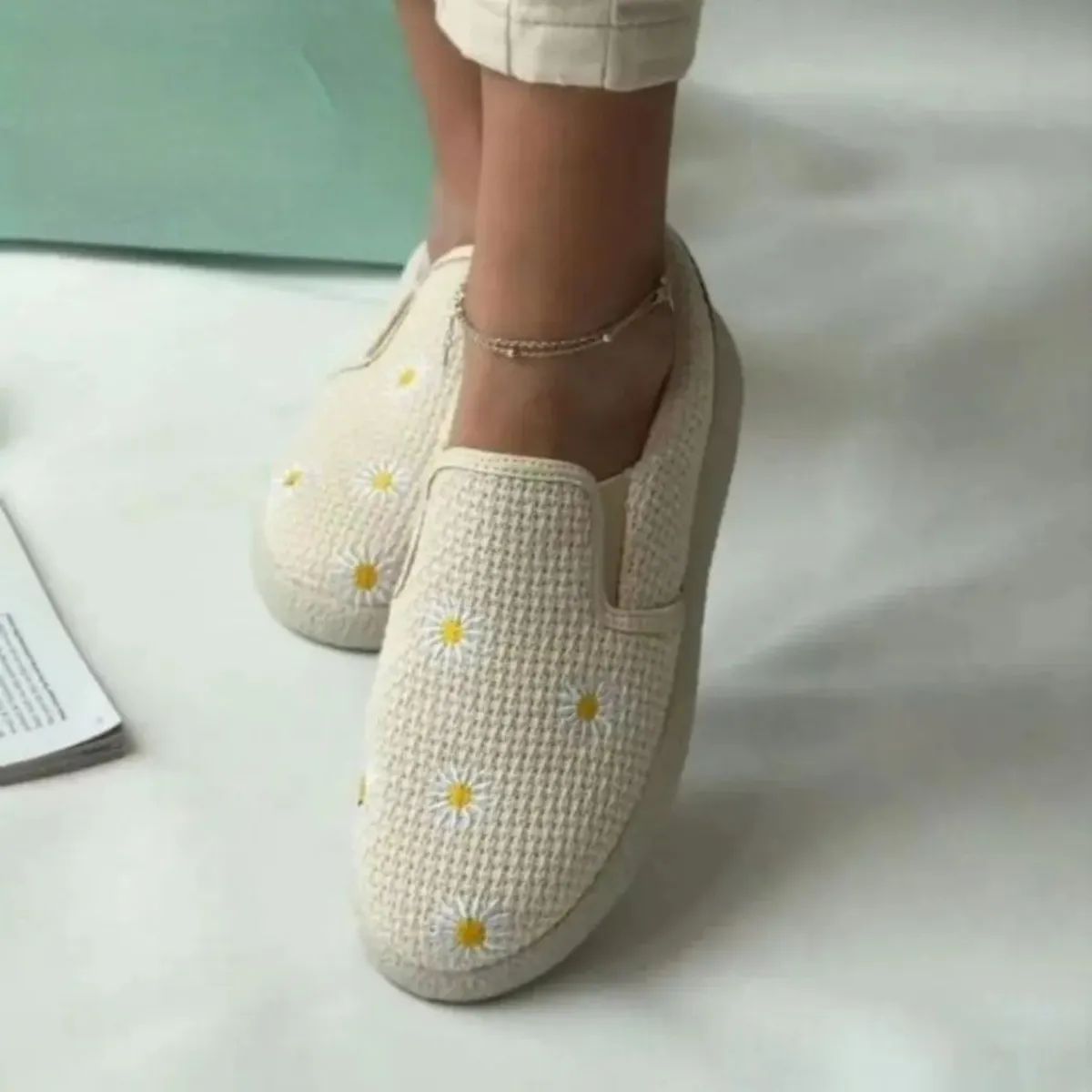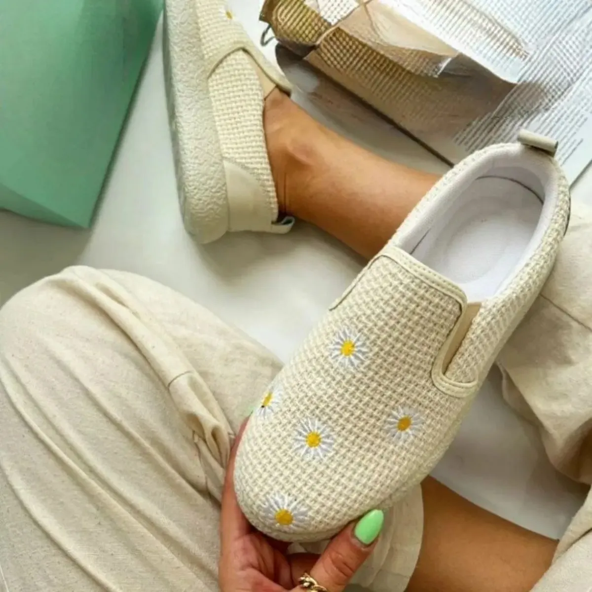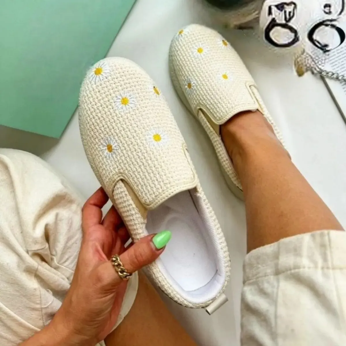 این مدل با طراحی فانتزی گل بابونه روی بدنه کفش، ظاهری شاد و تابستانی دارد و برای استفاده روزمره، دانشگاه، خرید یا گردشهای شهری کاملاً مناسب است.