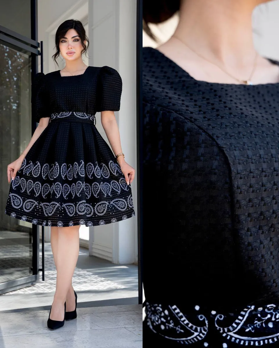 به دلیل زمینه مشکی و طرحهای ظریف و لاکچری، این مدل برای جشنها، تولدها، دورهمیهای رسمی و مهمانیهای شب بسیار مناسب است. فرم کمر فون باعث باریک دیده شدن قسمت کمر و برجسته شدن حالت عروسکی پیراهن میشود و همین ویژگی مایلا را به انتخابی عالی برای خانمهایی که استایل جذاب و دخترانه میپسندند تبدیل کرده است.