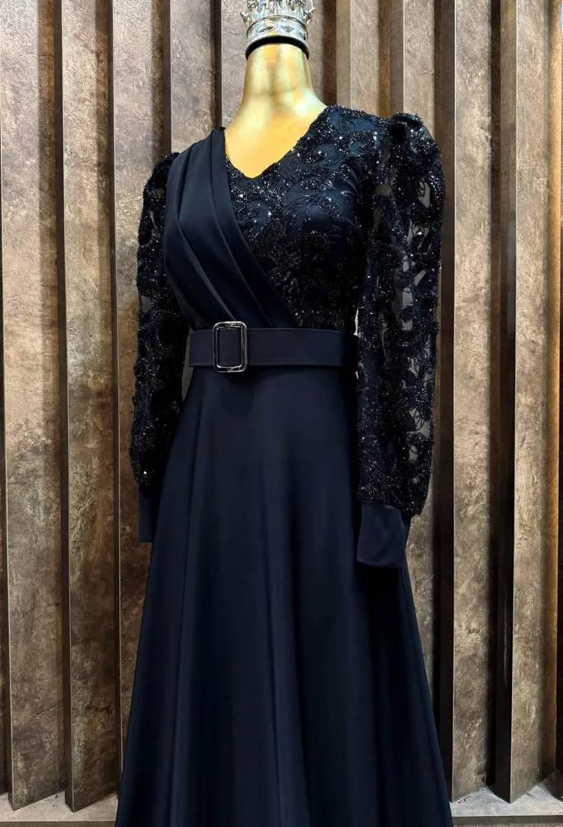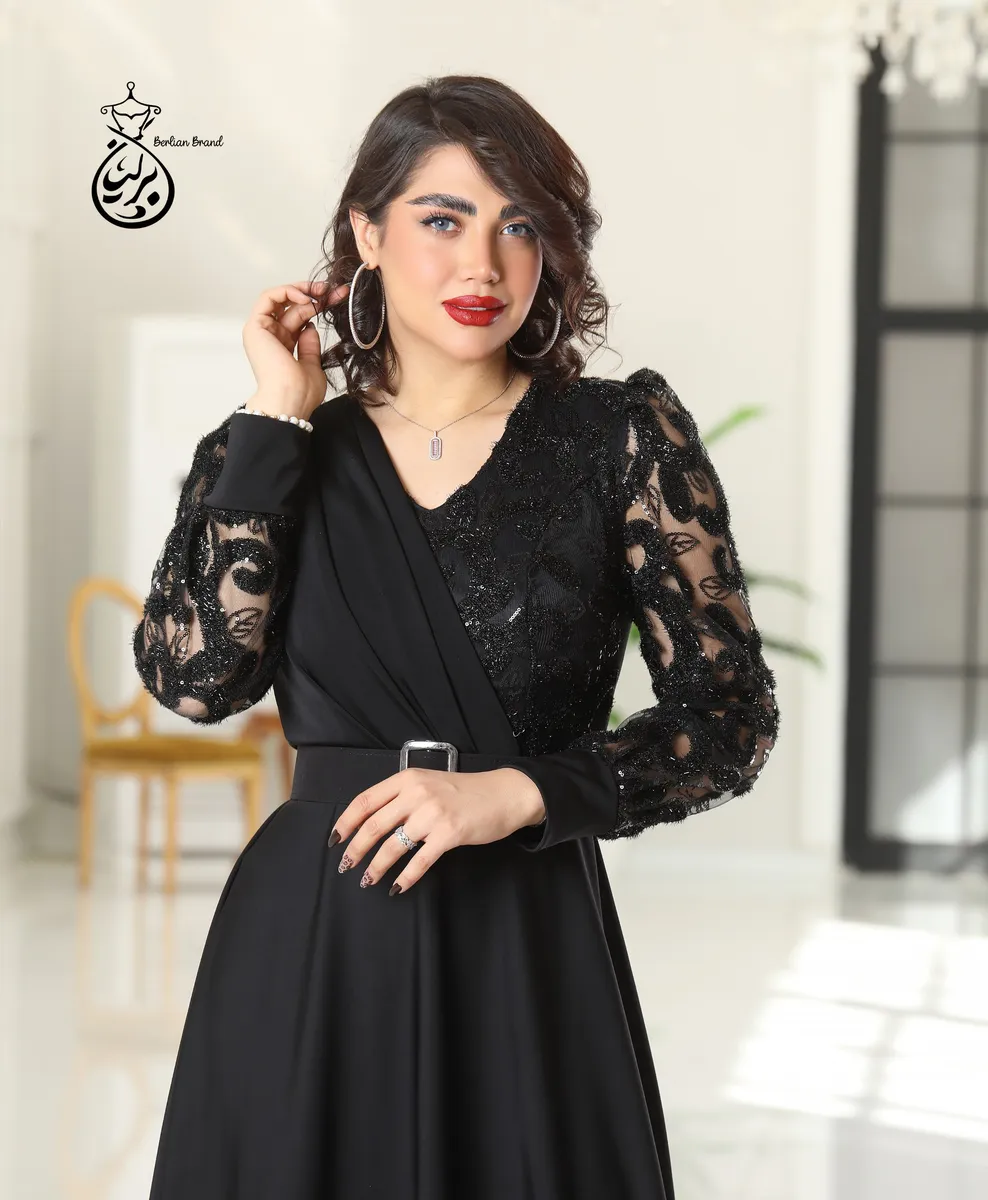 پارچه کرپ غواصی، ایستایی فوقالعادهای دارد و روی اندام سایز بزرگ بسیار خوشفرم مینشیند. وجود **کمربند همجنس** به خوشفرمی بیشتر کمک میکند و قسمت بالاتنه پولکی جلوه لوکس و مزونی به لباس میدهد.