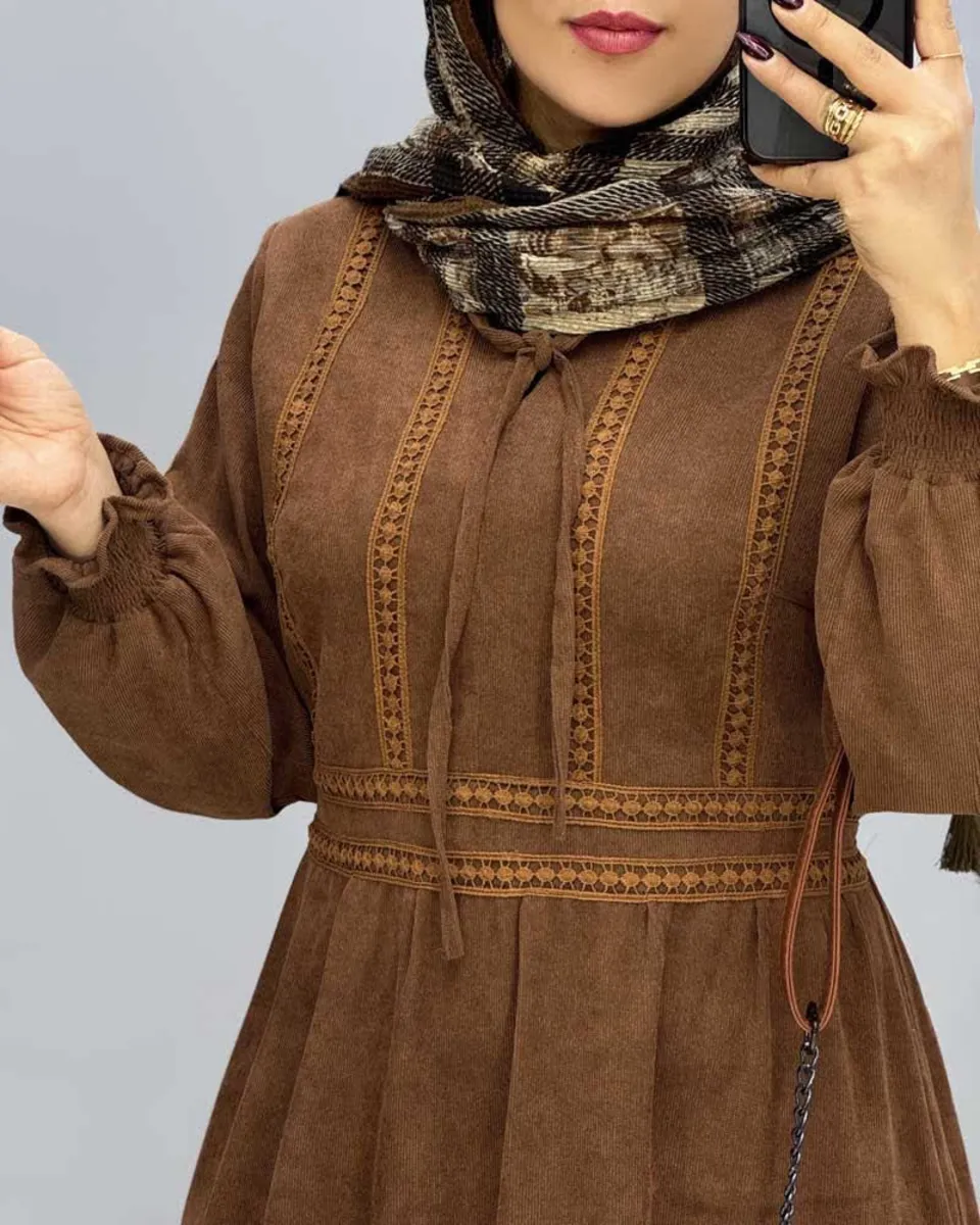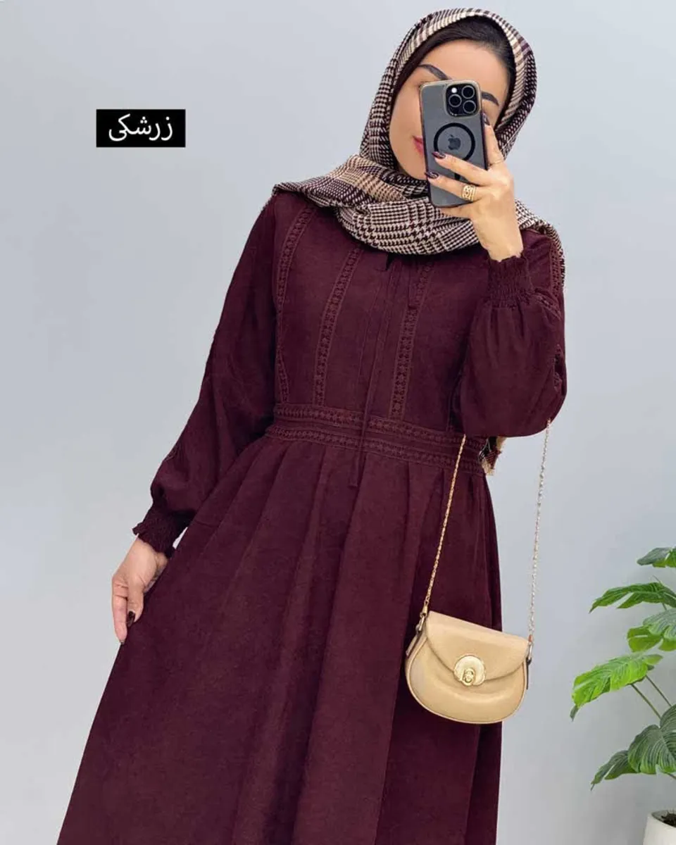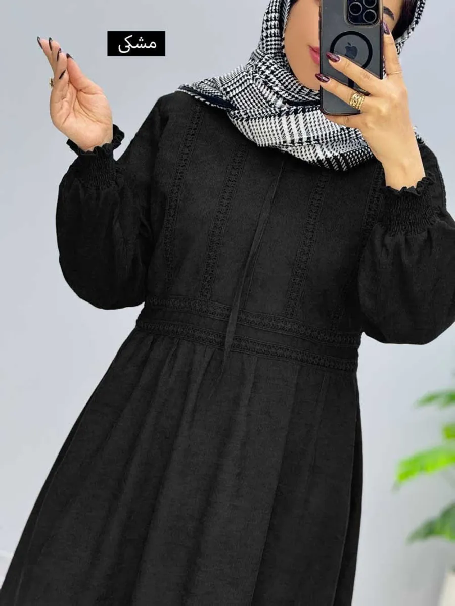 پیراهن مانتویی بلند مخمل کد 96894 یک مدل **پاییزه و زمستانی شیک** است که با مخمل درجه یک دوخته شده و بهلطف بافت براق و نرم پارچه، روی تن فرم کاملاً مجلسی و چشمگیر دارد. طراحی **یقه گرد V‑شکل** با بند تزئینی و **نوارهای گیپور دوزیشده**، این مدل را از حالت ساده خارج کرده و جلوهای مزونی و جذاب به آن داده است.