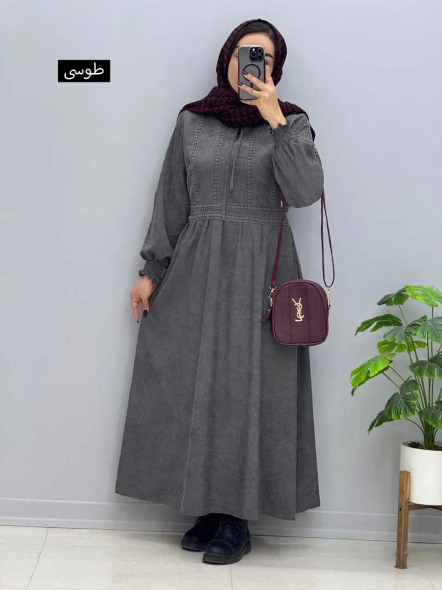 قد لباس **خیلی بلند (100 سانتیمتر به بالا)** بوده و برای استایلهای شیک و پوشیده عالی است. آستین بلند با **مچ کشدوزی** هم همزمان راحتی و زیبایی را فراهم میکند. مدل **جلوبسته** و مناسب فصلهای سرد سال است.