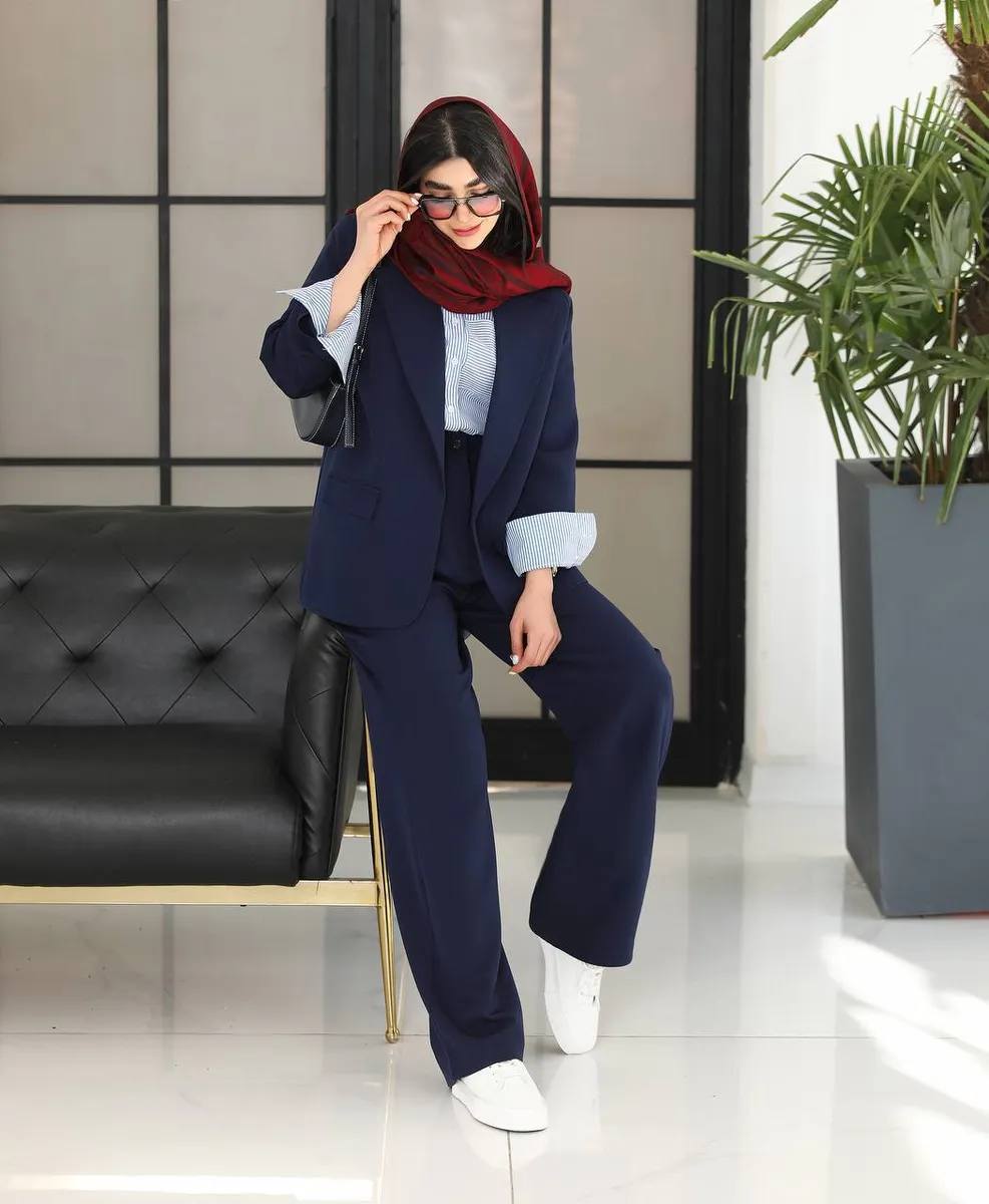 قد کت حدود **75 سانتیمتر** و قد شلوار حدود **110 سانتیمتر** بوده و همین ترکیب، استایل را کشیده، مرتب و بسیار شکیل نشان میدهد.