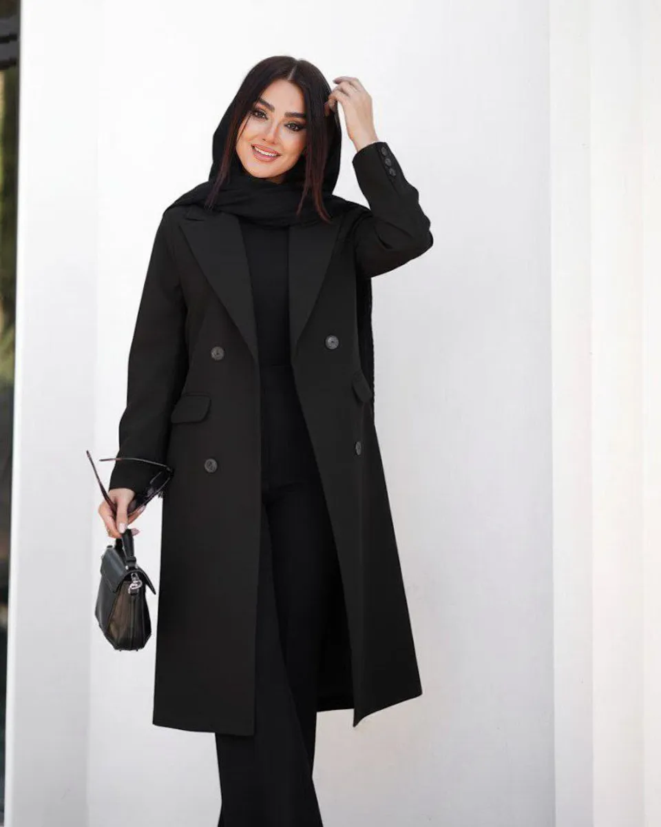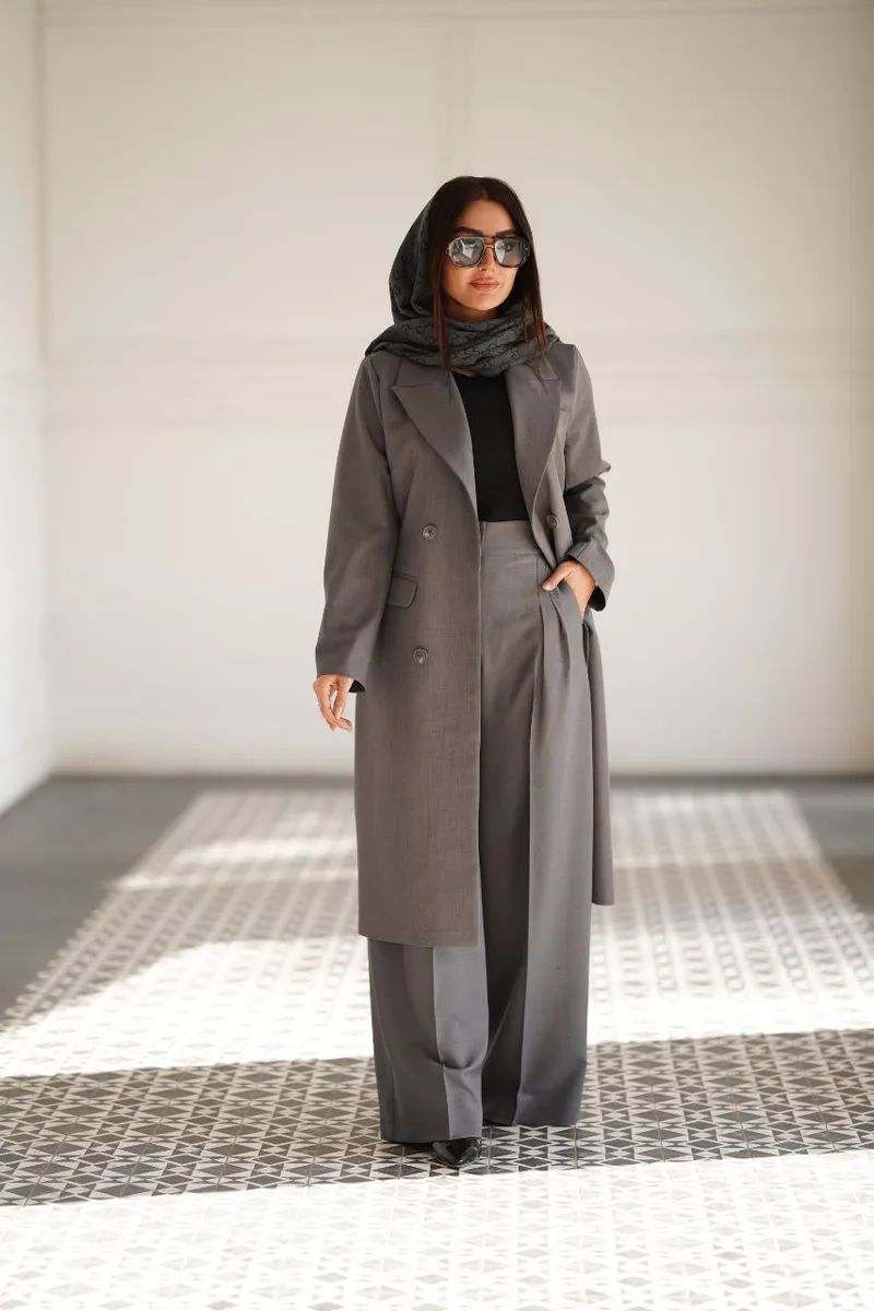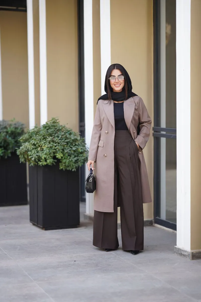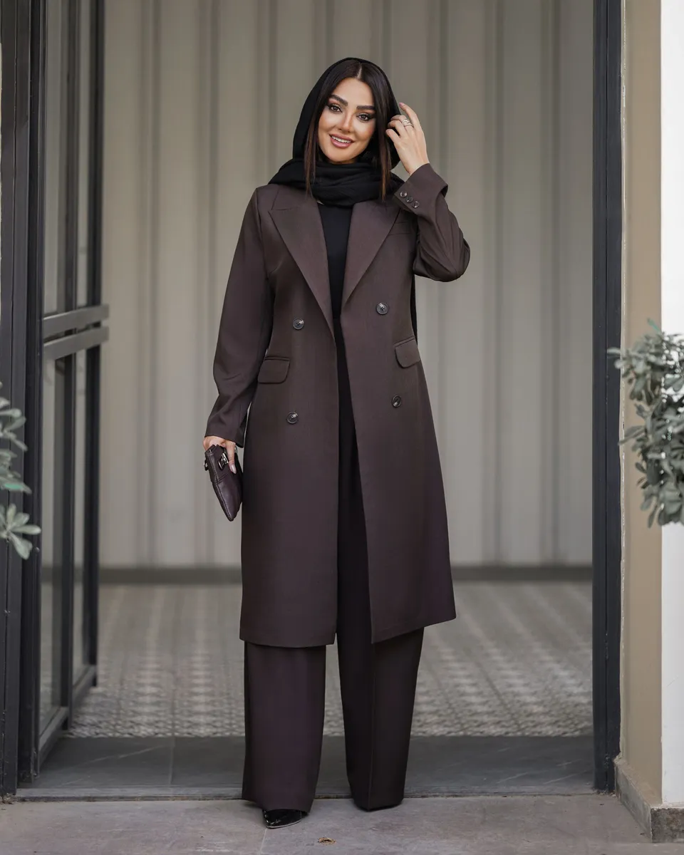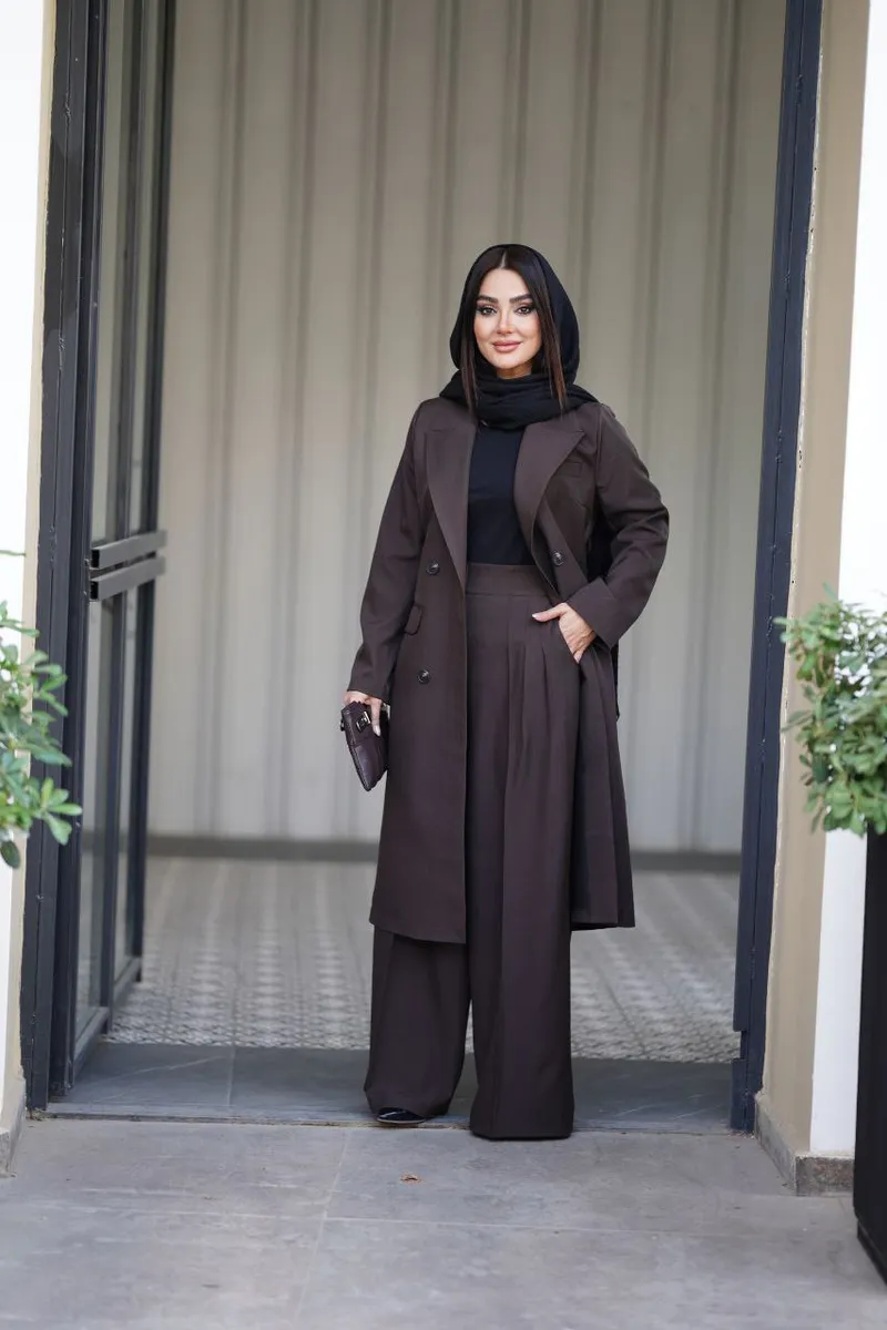 ست مانتو شلوار **نادی** از پارچه **بزیاق درجهیک** دوخته شده و یک انتخاب شیک و خوشفرم برای استایل پاییزه و زمستانه است.