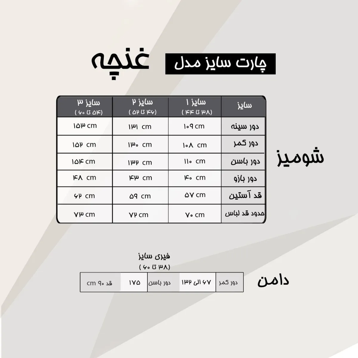 سایز ها : سایز دو 46 تا 52, سایز سه 54 تا 60, سایز یک 38 تا 44