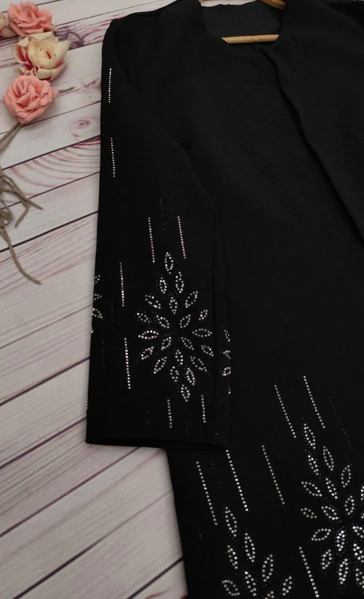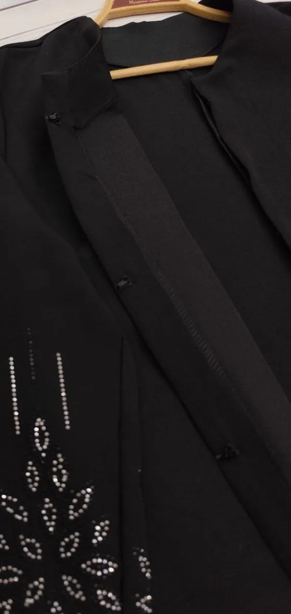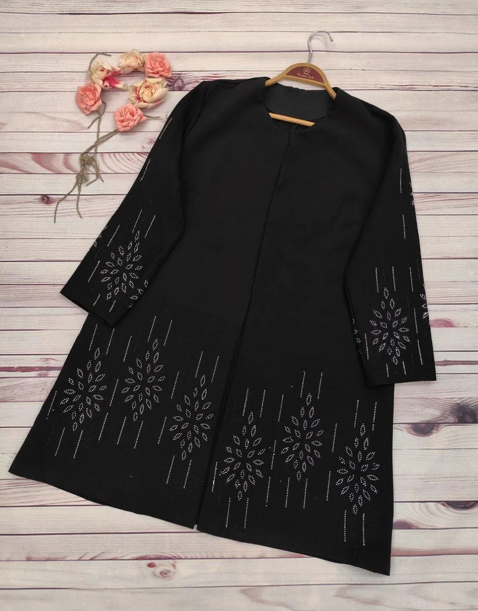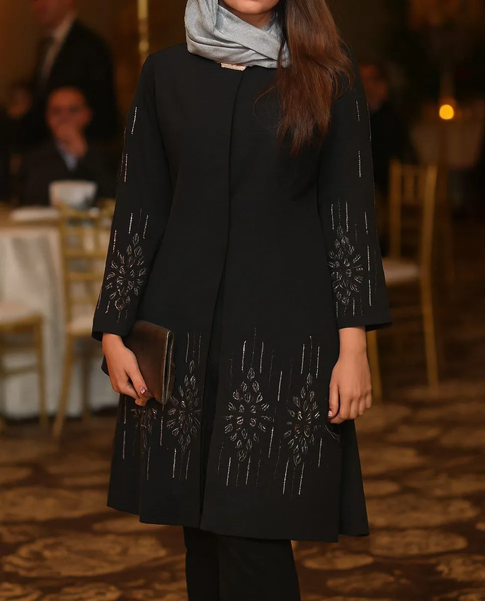 پیشکار با غزن مخفی بسته میشود و رویهی مانتو با نگینکاری DMC کار شده که تراکم و درخشش آن بهمراتب بالاتر از نمونههای مشابه بازار است و ظاهر کار را کاملاً مجلسی و چشمگیر میکند.