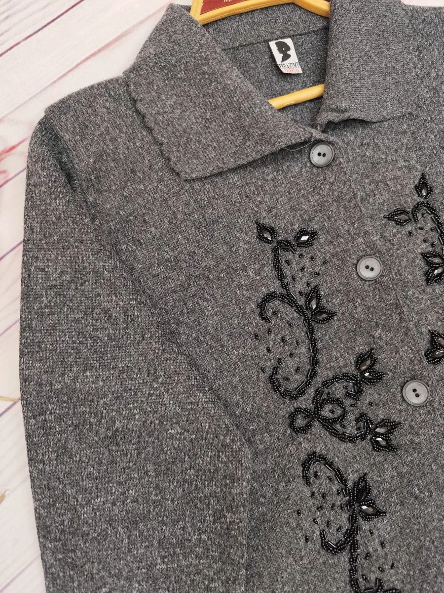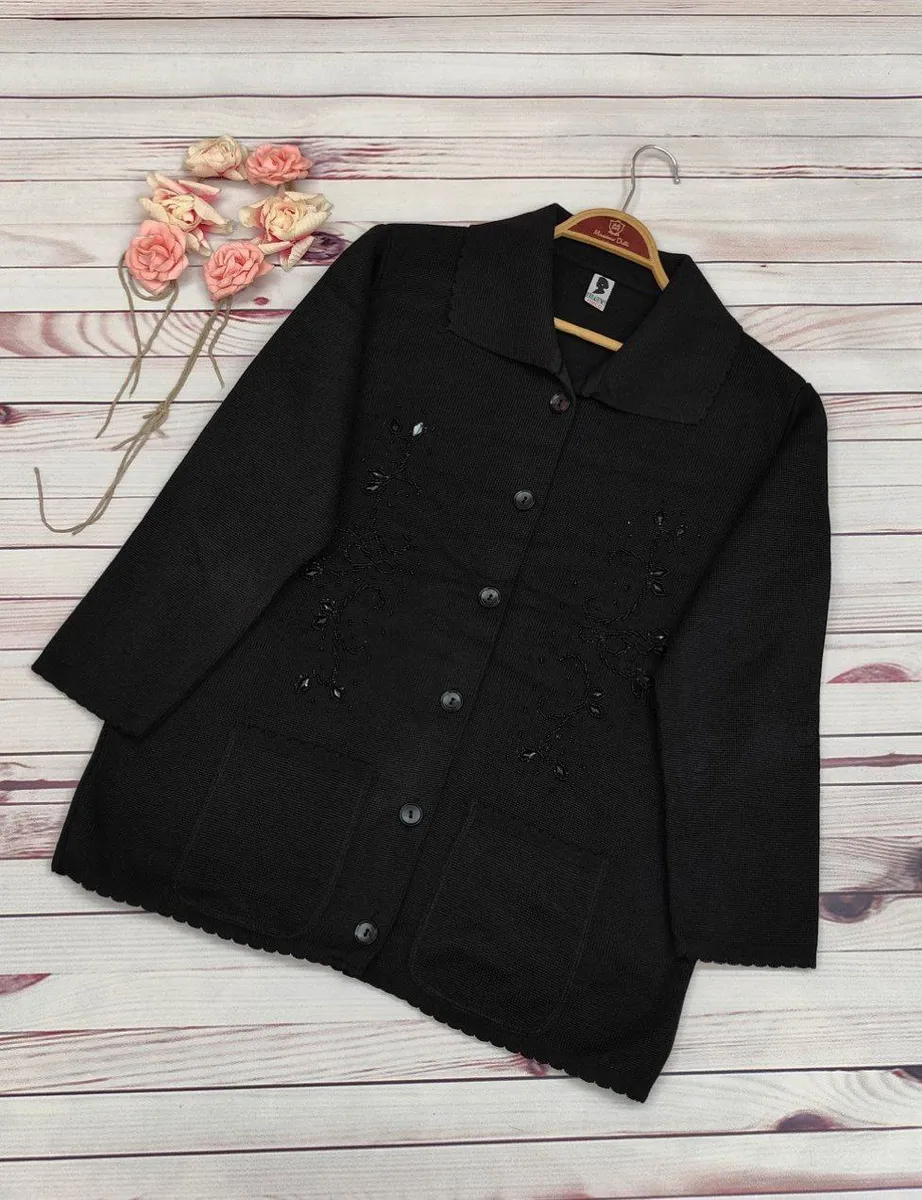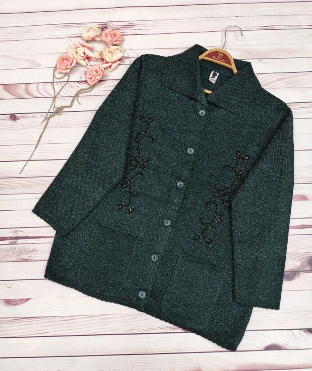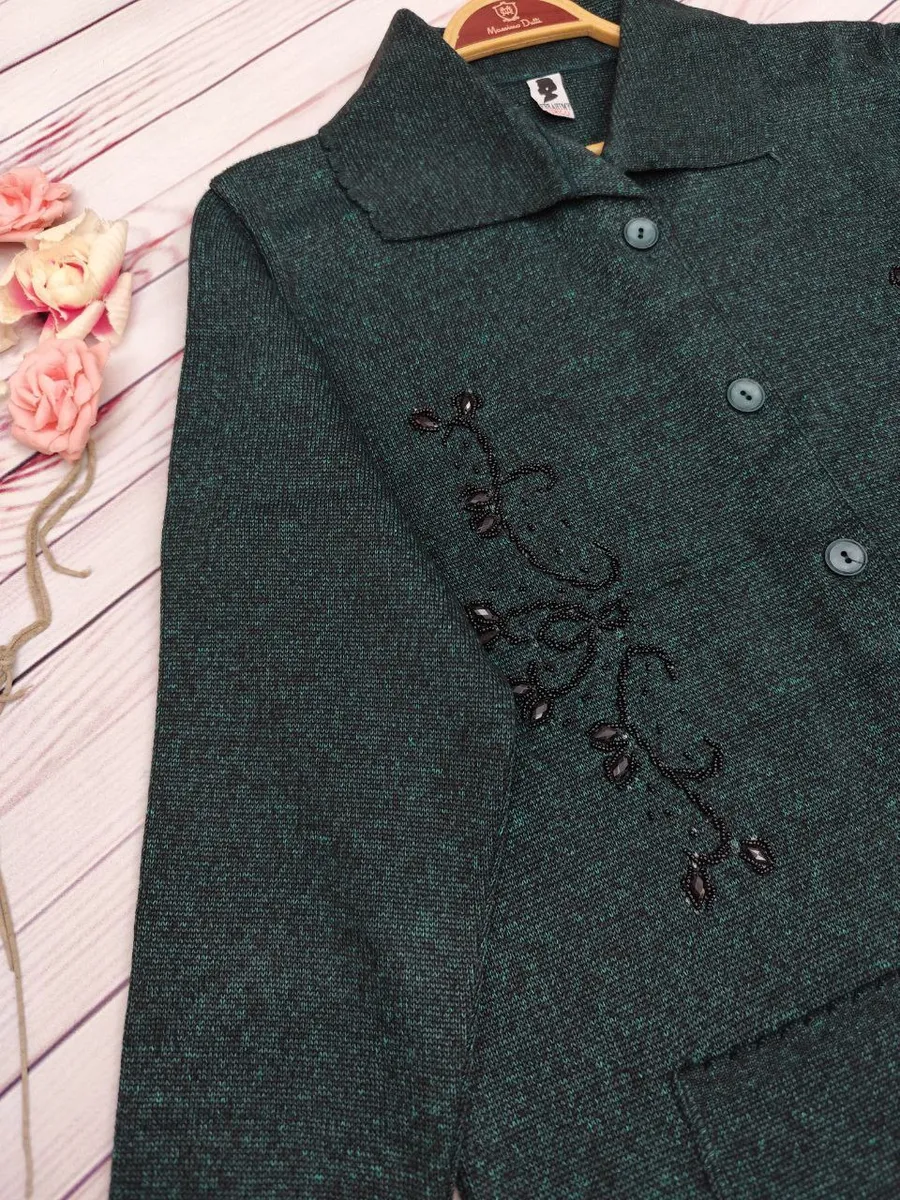 این ژاکت بهصورت جلو دکمهدار طراحی شده و رویه آن سنگدوزی ظریف دارد که ظاهر کار را خاصتر و شیکتر میکند.