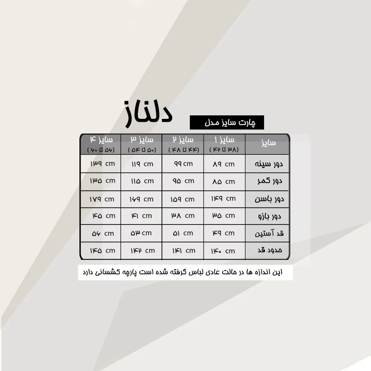 سایز ها : سایز چهار 56 تا 60, سایز دو 44 تا 48, سایز سه 50 تا 54, سایز یک 38 تا 42