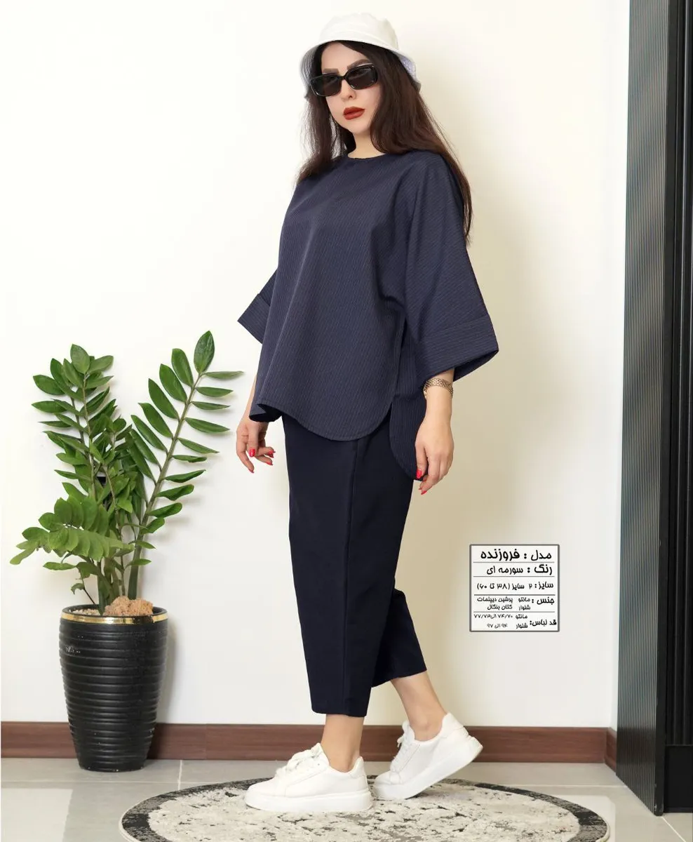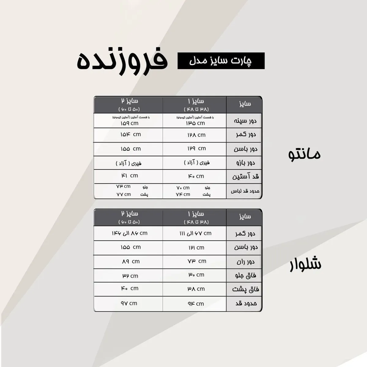 ست فروزنده در دو رنگ پرطرفدار مشکی و سورمهای عرضه میشود و با توجه به قد استاندارد شلوار (94 تا 97 سانتیمتر) و شومیز (حدود 70 تا 77 سانتیمتر)، تنخوری متناسب و خوشفرم دارد. این محصول با ارسال فوری 2 تا 3 روز پس از ثبت سفارش آماده ارسال میباشد.