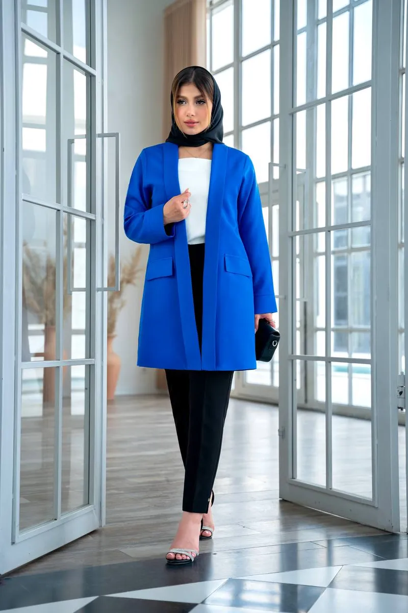 این مدل بدون دکمه و جلوباز طراحی شده که جلوهای مدرن، کشیده و بسیار خوشفرم روی تن ایجاد میکند.
