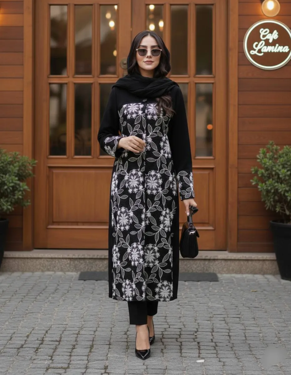 🔶 جزییات: طراحی خیرهکننده و گلدوزیهای متراکم روی زمینه مشکی عمیق؛ مدل جلو دکمهدار با تنخور قوارهدار و عالی؛ گلدوزی شده در قسمت جلو و سرآستینها (تنخور بینظیر 🅰️ - دوخت مزونی و تضمینی 🅰️)