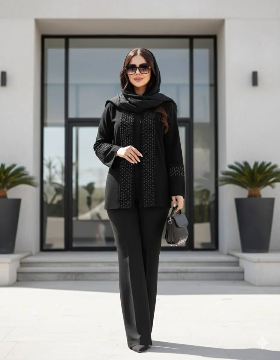 💡 پیشنهاد استایل: این مانتو به دلیل طراحیِ عمودی خرجکار، با شلوارهای بوتکات (دمپا) برای بلندتر دیده شدن قد و یا شلوارهای سیگارتی و بگ برای استایلی کلاسیک و مدرن به راحتی ست میشود.