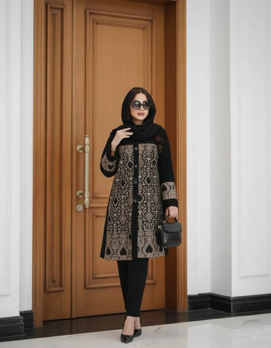 🌟 💎 کد 0302: مانتو کتی بلند با طرحهای اسلیمی طلایی «اصالت در طراحی و ظرافت در دوخت»