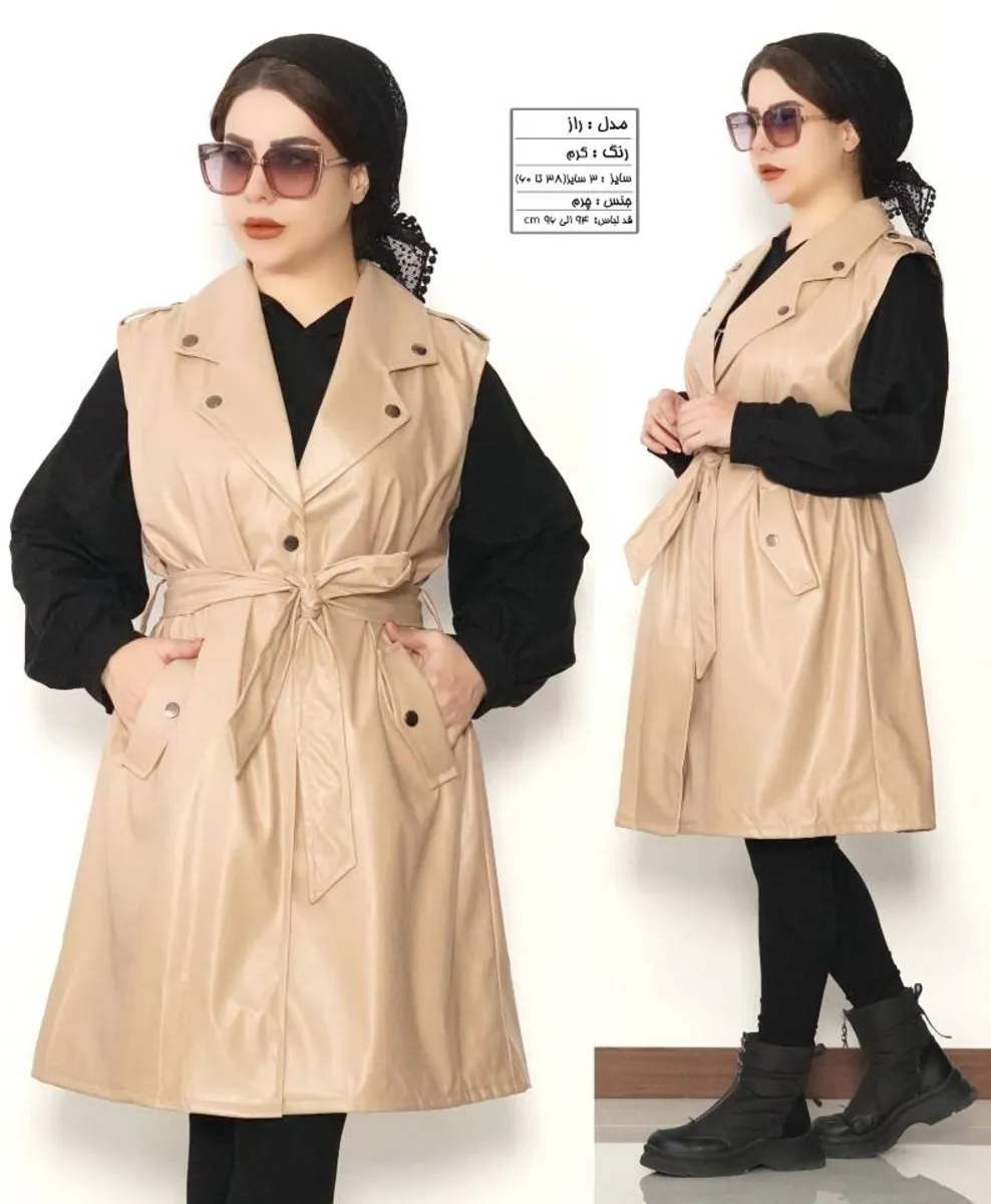 جزئیات: جلوی لباس دکمههای کاربردی دارد، دارای دو جیب و کمربند قابل تنظیم در دور کمر برای فرمدهی بهتر است.