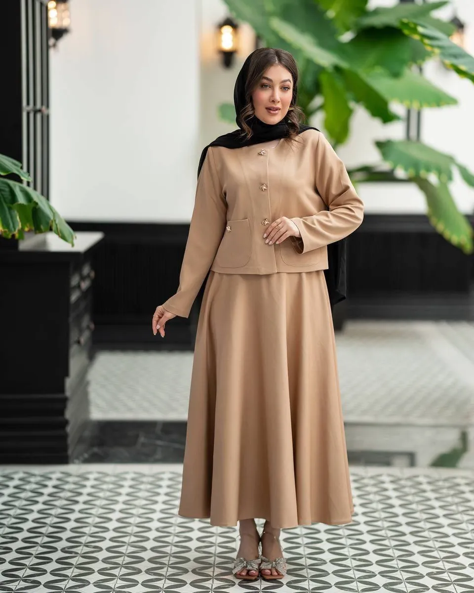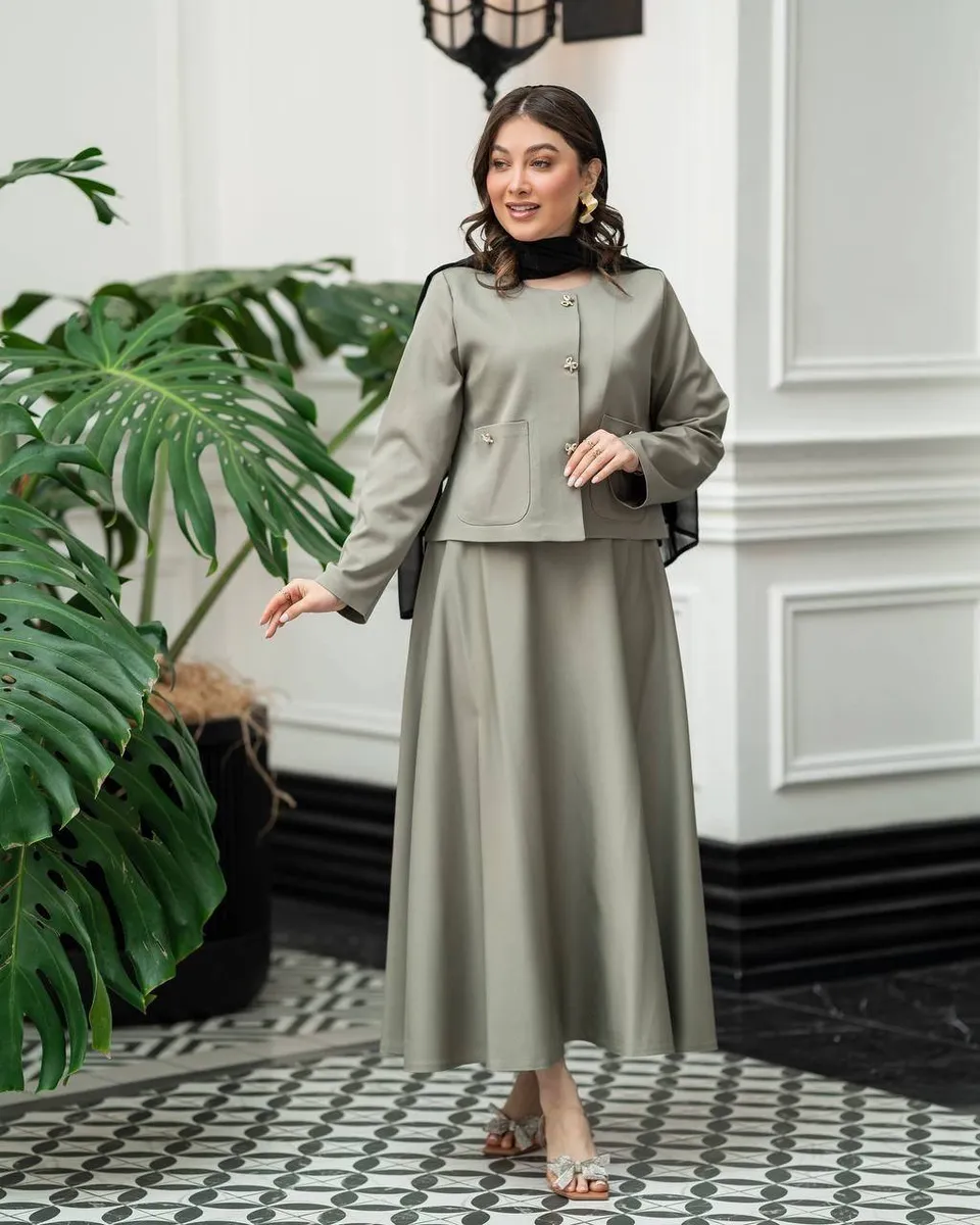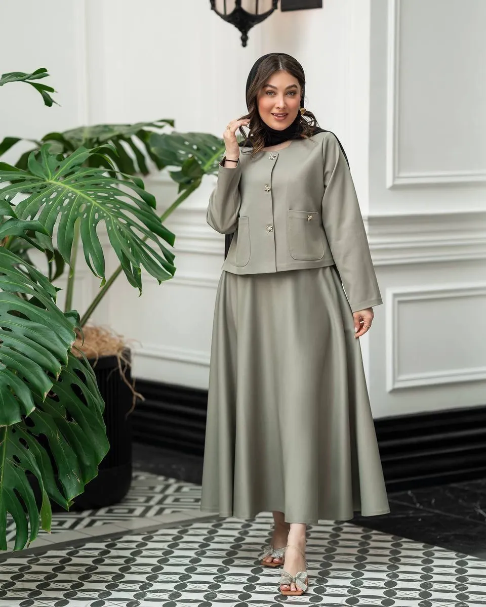 این ست کت و دامن مجلسی با پارچه مازراتی کجراه، انتخابی شیک و رسمی برای استایلهای عیدانه و مراسم خاص است. ایستایی عالی پارچه در کنار برش تمیز، تنخوری بسیار مرتب و زنانه ایجاد میکند. قد کوتاه و خوشفرم کت در ترکیب با دامن بلند، باعث کشیدهتر دیده شدن اندام شده و استایلی ظریف و کلاسیک میسازد. این مدل برای مهمانیهای نوروزی، دورهمیهای رسمی و استایلهای مجلسی کاملاً ایدهآل بوده و بهراحتی با کفش پاشنهدار یا کیفهای مجلسی ست میشود.