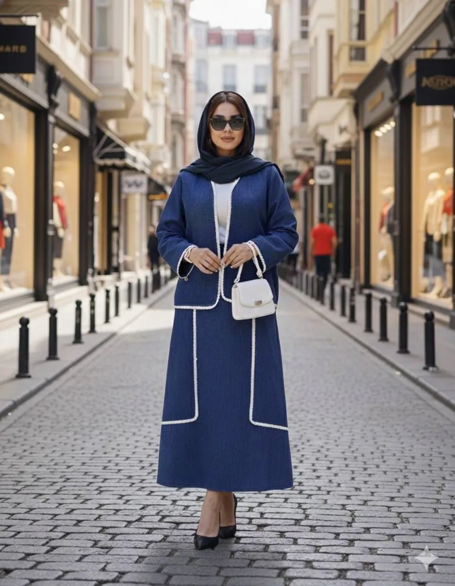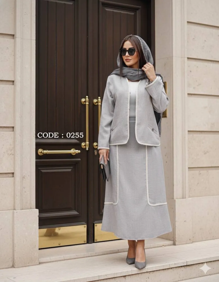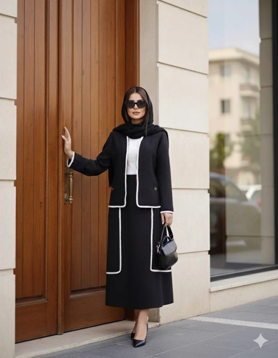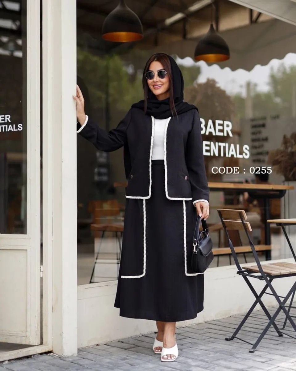 🔶 جزییات: نوار دوزی شده حرفهای در حاشیه کت و قسمت جلوی دامن؛ دارای قزن مخفی؛ دامن کمرکش (تنخور عالی 🅰️ -تضمین کیفیت دوخت مزونی 🅰️)