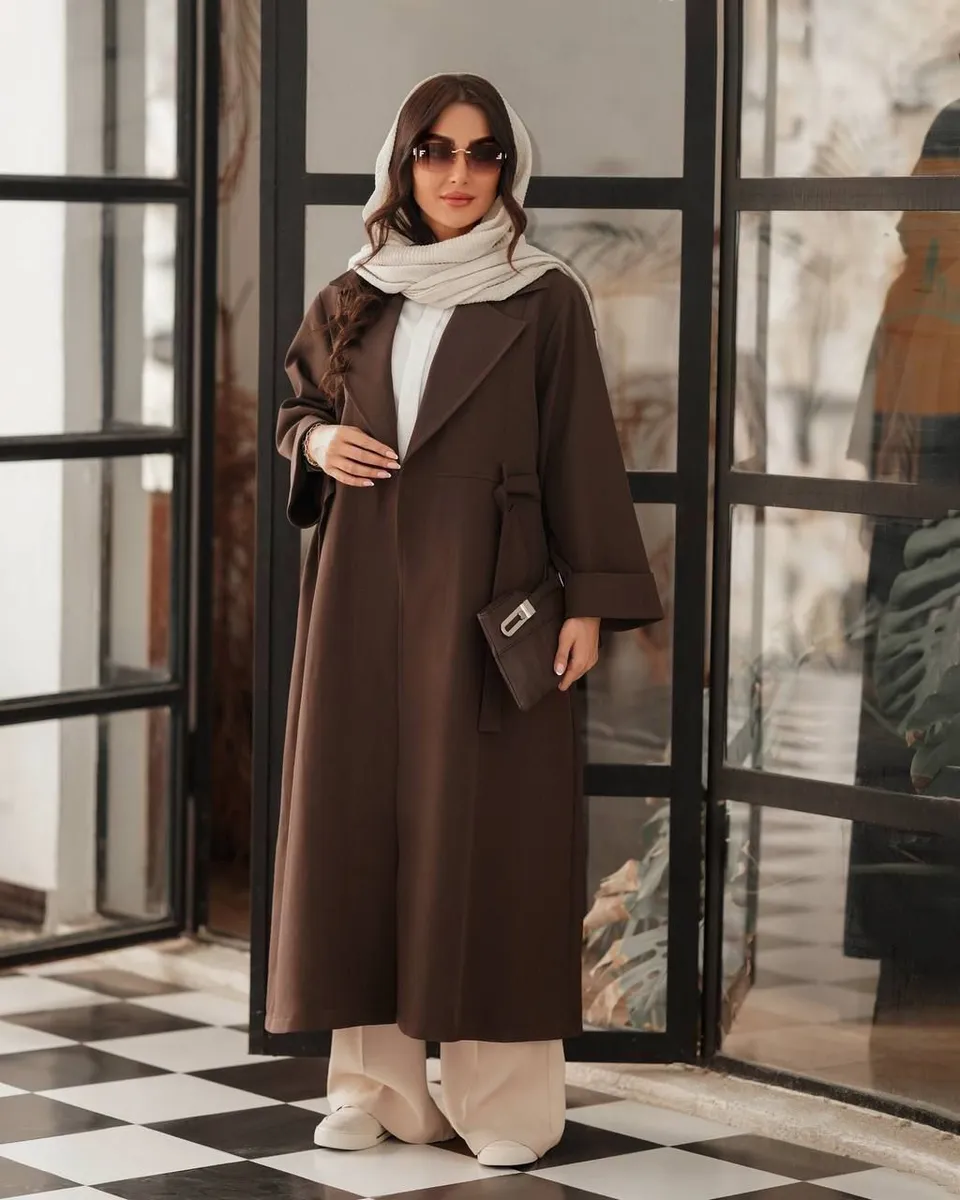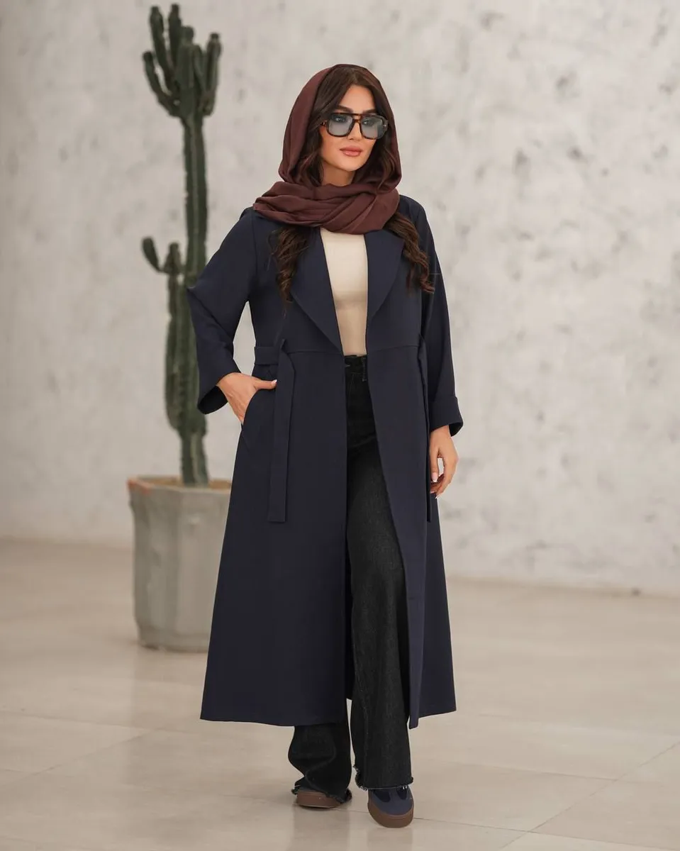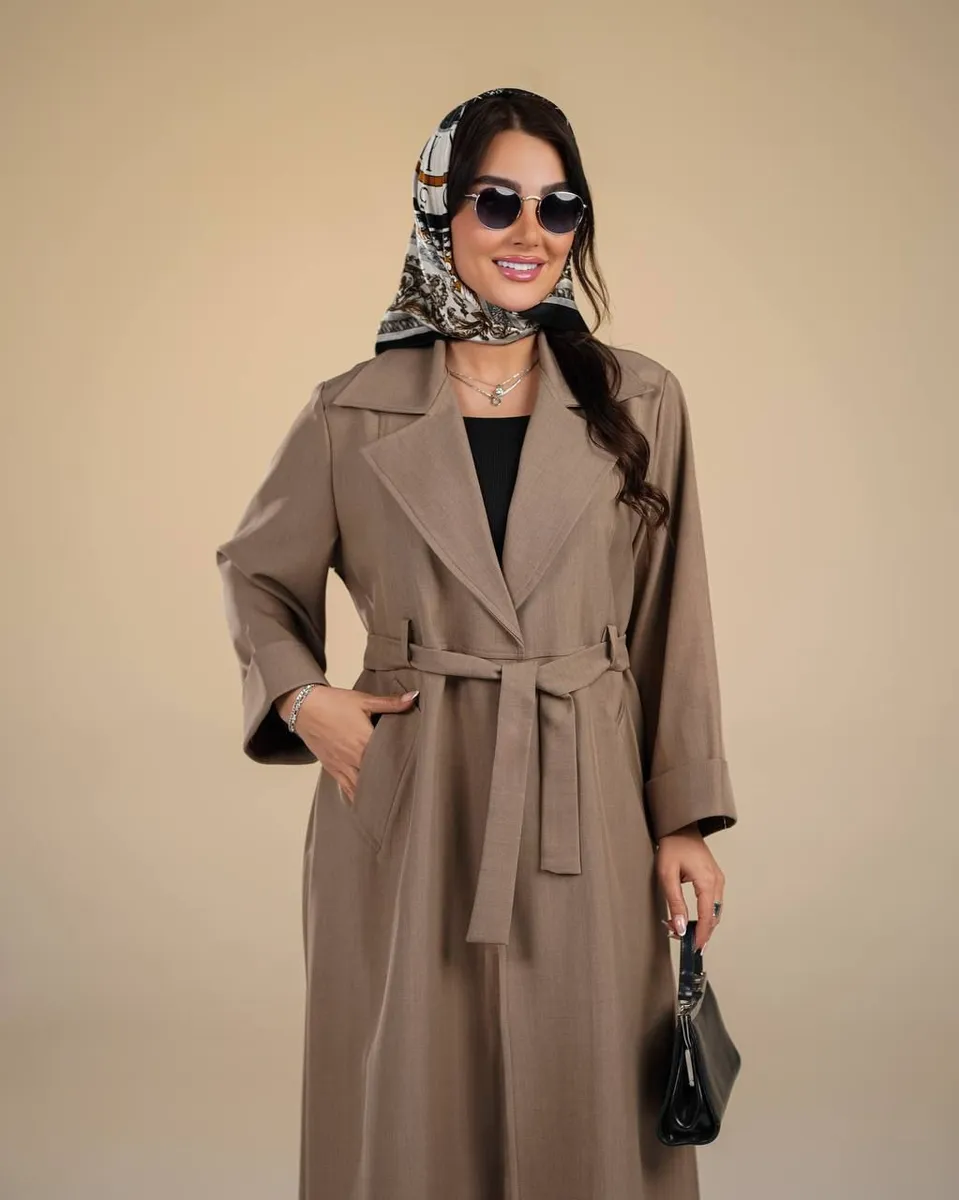 - مدل طراحی: کت ماکسی یقه انگلیسی، کمردار