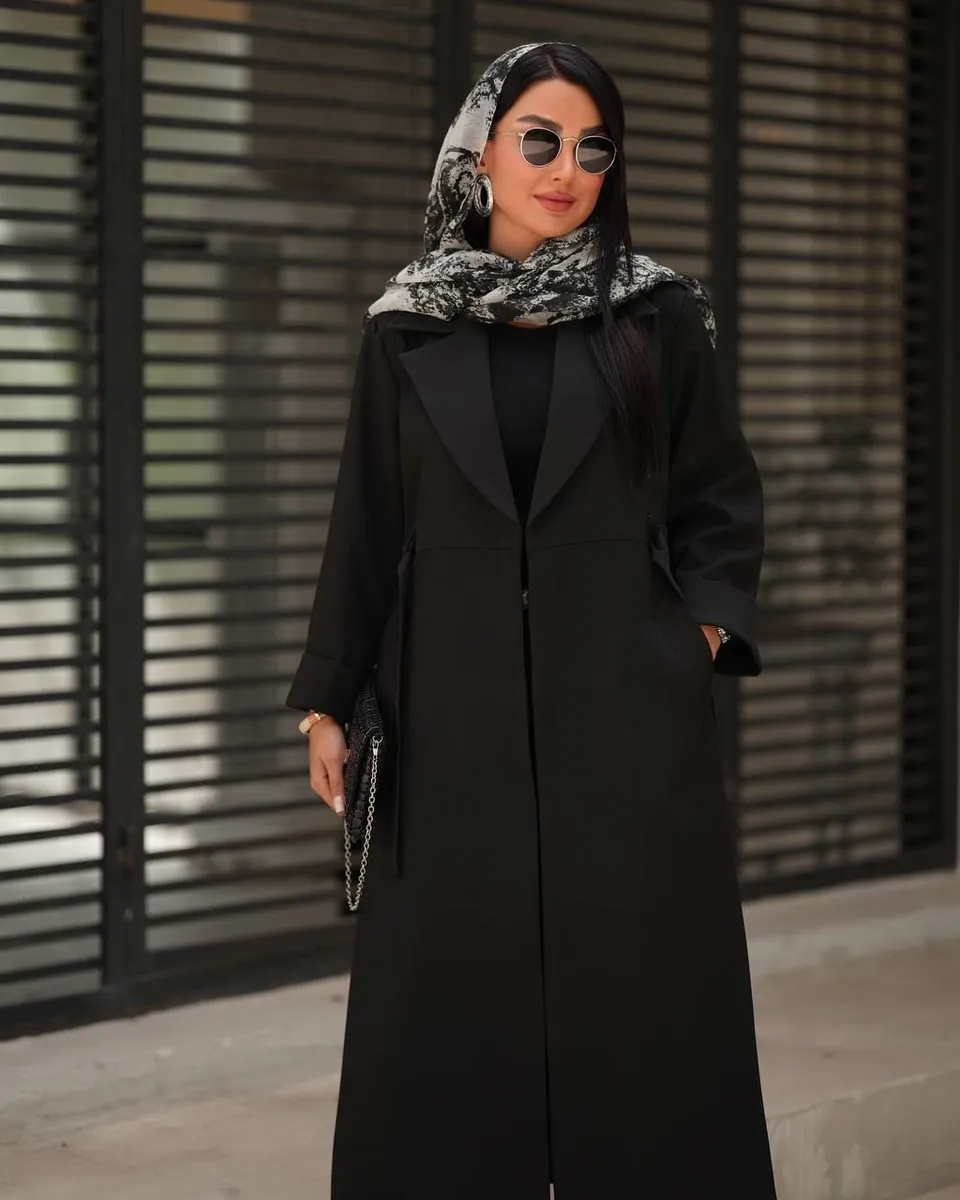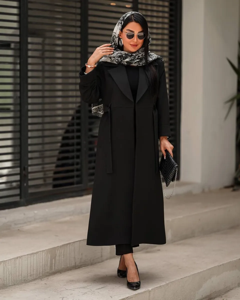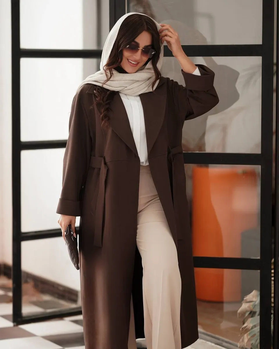 - مدل طراحی: کت ماکسی یقه انگلیسی، کمردار