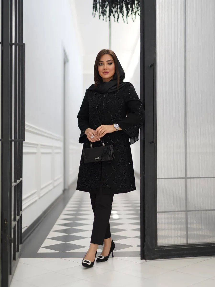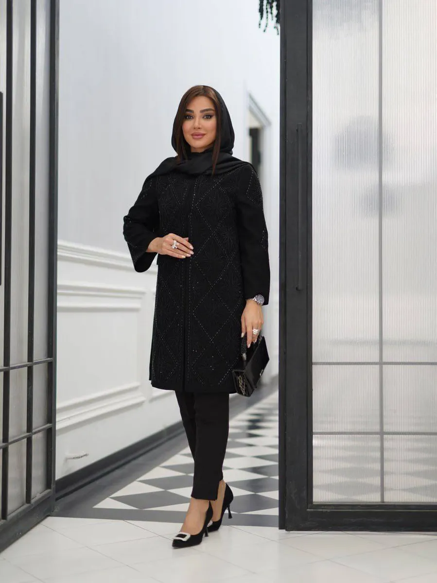 * **طرح و دوخت:** یقه گرد کلاسیک که با **آینهکاری و نگیندوزی ظریف** تزئین شده و جلوکار و تمام آستینها با **لایی پرشین درجهیک** لاییخوردگی شدهاند تا فرمی ایدهآل و ماندگار داشته باشند.