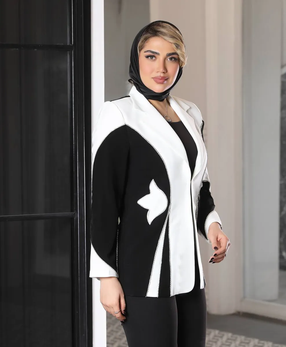 طراحی **گلهای لیزر شده** به همراه **نگیندوزی ظریف**، جلوهای فاخر و چشمنواز به کت بخشیده و آن را به گزینهای ایدهآل برای بانوان خوشسلیقه تبدیل کرده است. مدل **کت سفید–مشکی**، از ترندهای پرطرفدار عید بوده و بهراحتی با شلوار، دامن یا اکسسوریهای مجلسی ست میشود.
