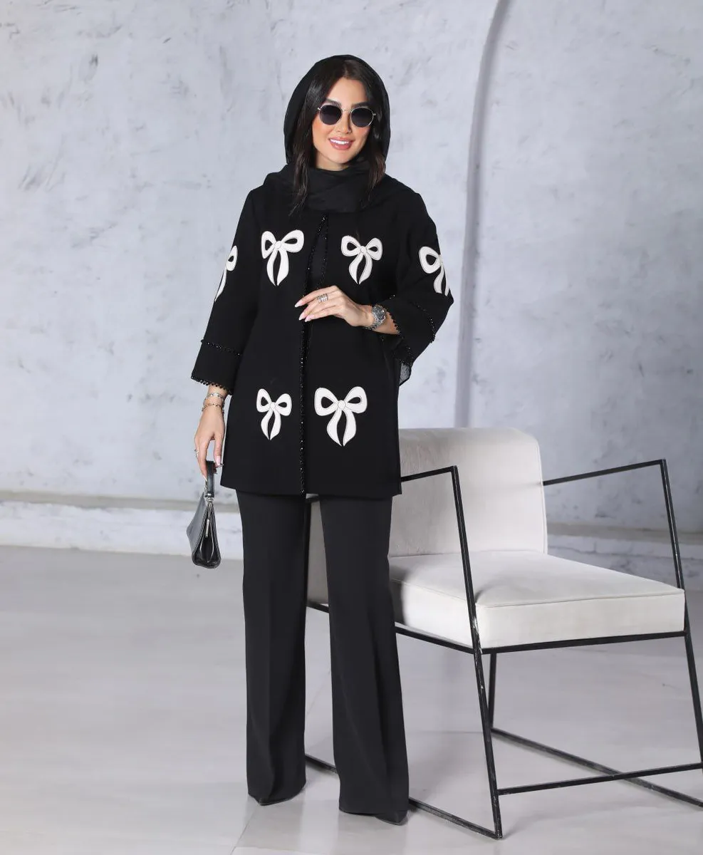مانتو مجلسی دلبر با طراحی ظریف و دخترانه، انتخابی شیک و خاص برای بانوان سایز بزرگ است. این مدل از پارچه مرویجت جتبلک با رنگ مشکی عمیق و ایستایی عالی دوخته شده که جلوهای کاملاً رسمی و مجلسی به استایل میدهد. طراحی کت یقه گرد همراه با گلدوزی و کریستالدوزی ظریف و جزئیات پاپیونی، حس یک مانتوی مزونی و چشمنواز را ایجاد کرده و بدون شلوغی، ظاهری لوکس و مرتب به کار بخشیده است.