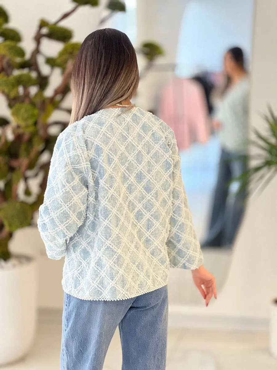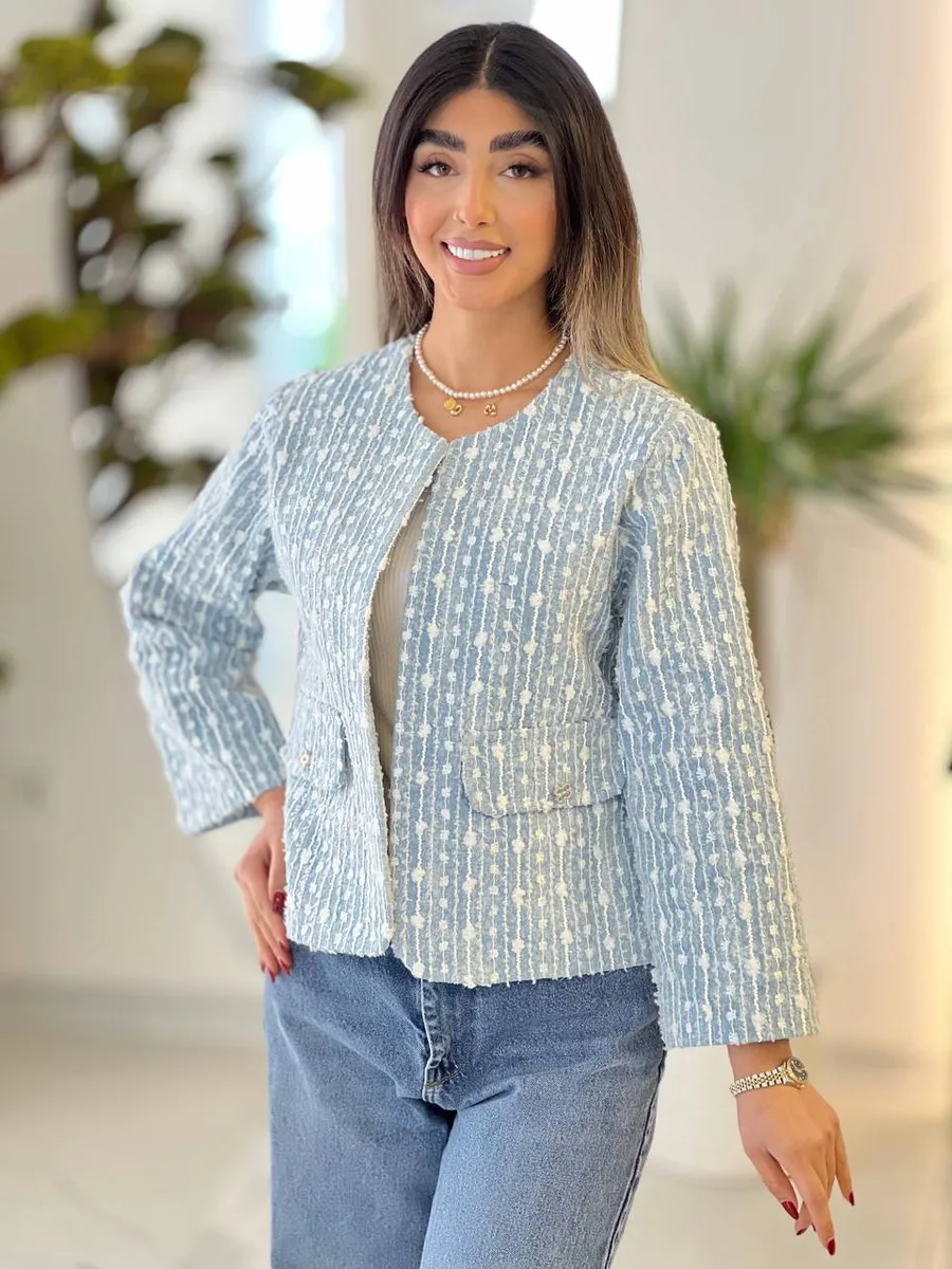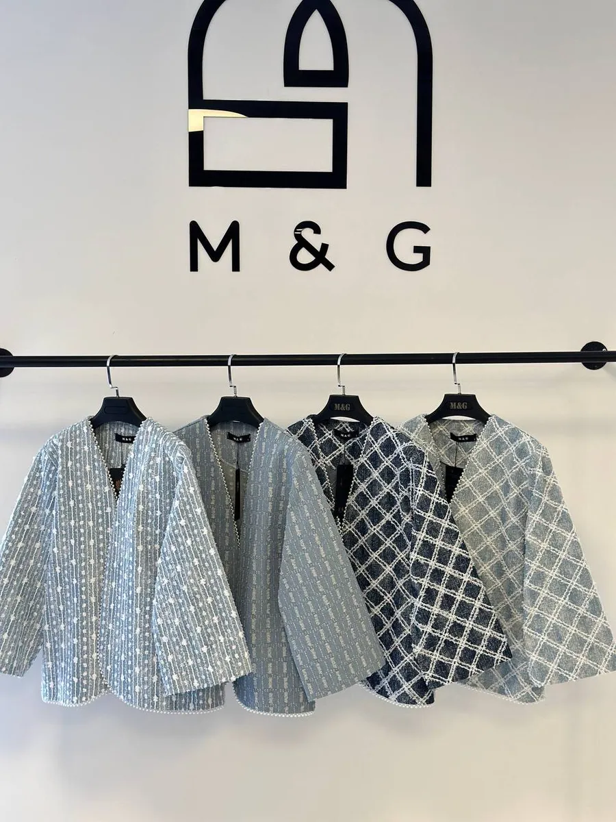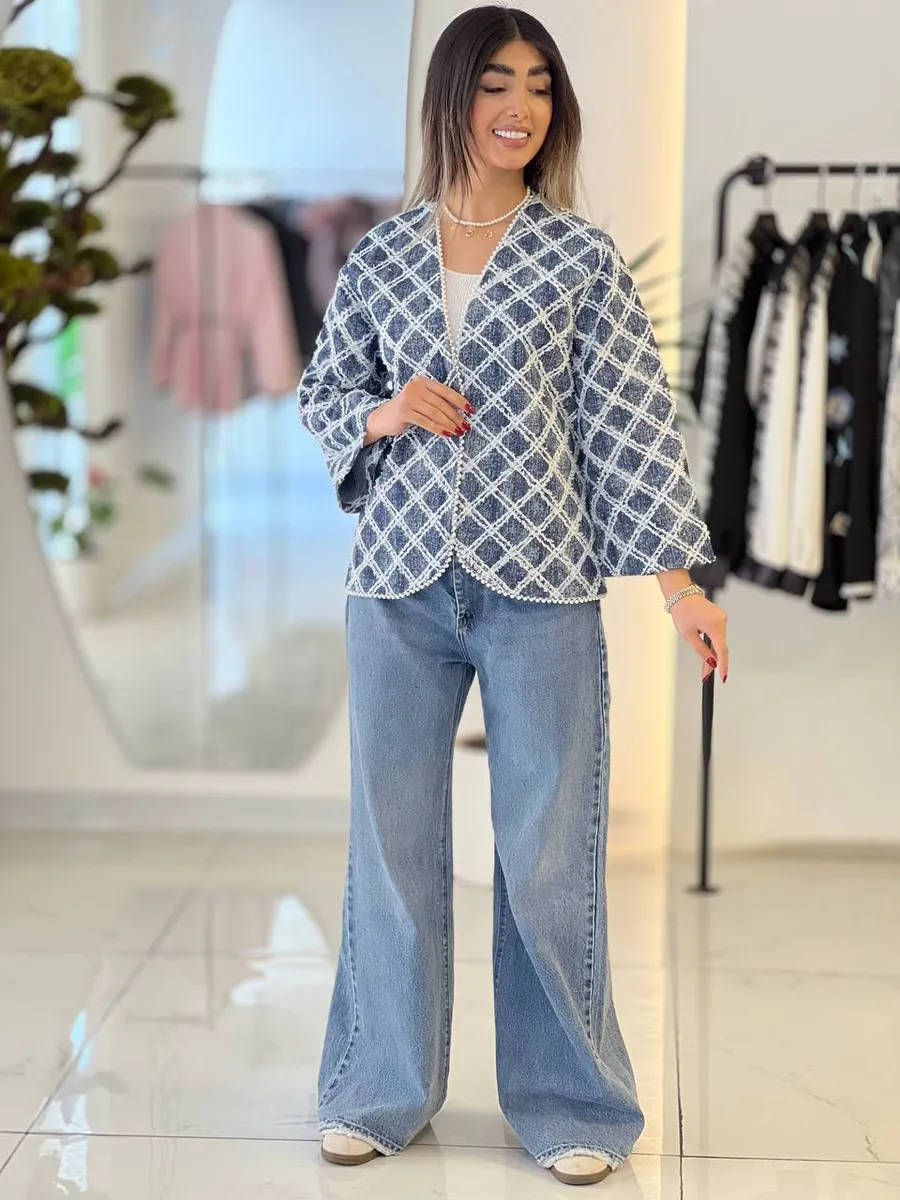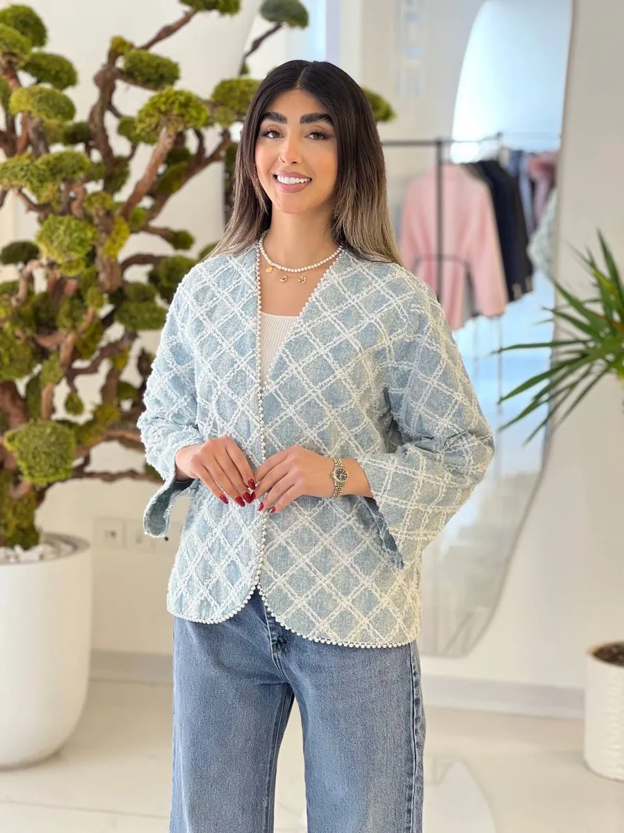 این کت از **پارچه جین طرحدار** باکیفیت تهیه شده است که برخلاف جینهای ساده، جلوهای بصری و پویا دارد. یکی از نقاط قوت اصلی این کار، استفاده از **مغزیدوزیهای مرواریدی سفید** است که دورتادور یقه و جلوی کار را احاطه کرده و تضاد رنگی فوقالعادهای با بافت جین ایجاد میکند.